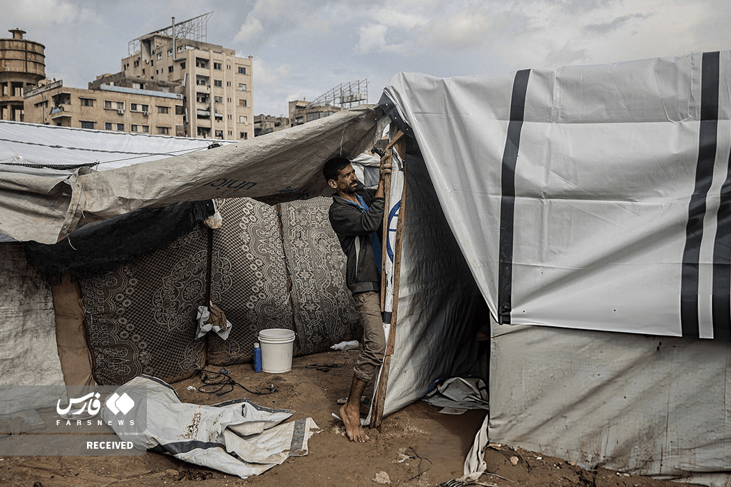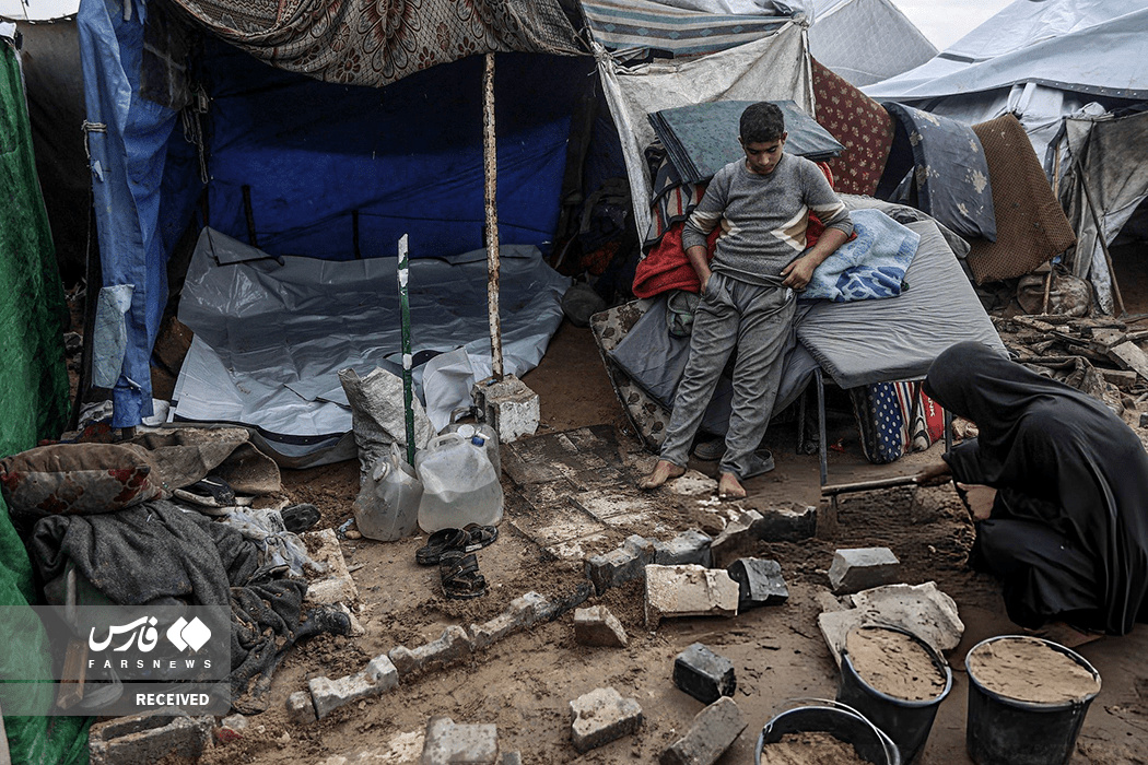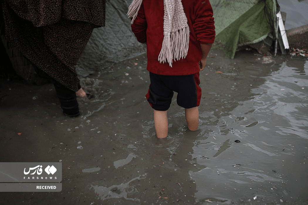 فلسطینیهای آواره پس از بارش شدید باران و جاری شدن سیل در چادرهایشان در اردوگاههای موقت آوارگان در شهر غزه، در وضعیت وخیمی به سر میبرند. این در حالی است که سازمان ملل متحد هشدار داده است که ممانعت اسرائیل در زمینه کمکرسانی، صدها هزار خانواده را بدون سرپناه مناسب رها کرده است. منبع: فارس