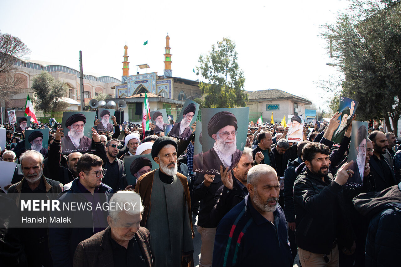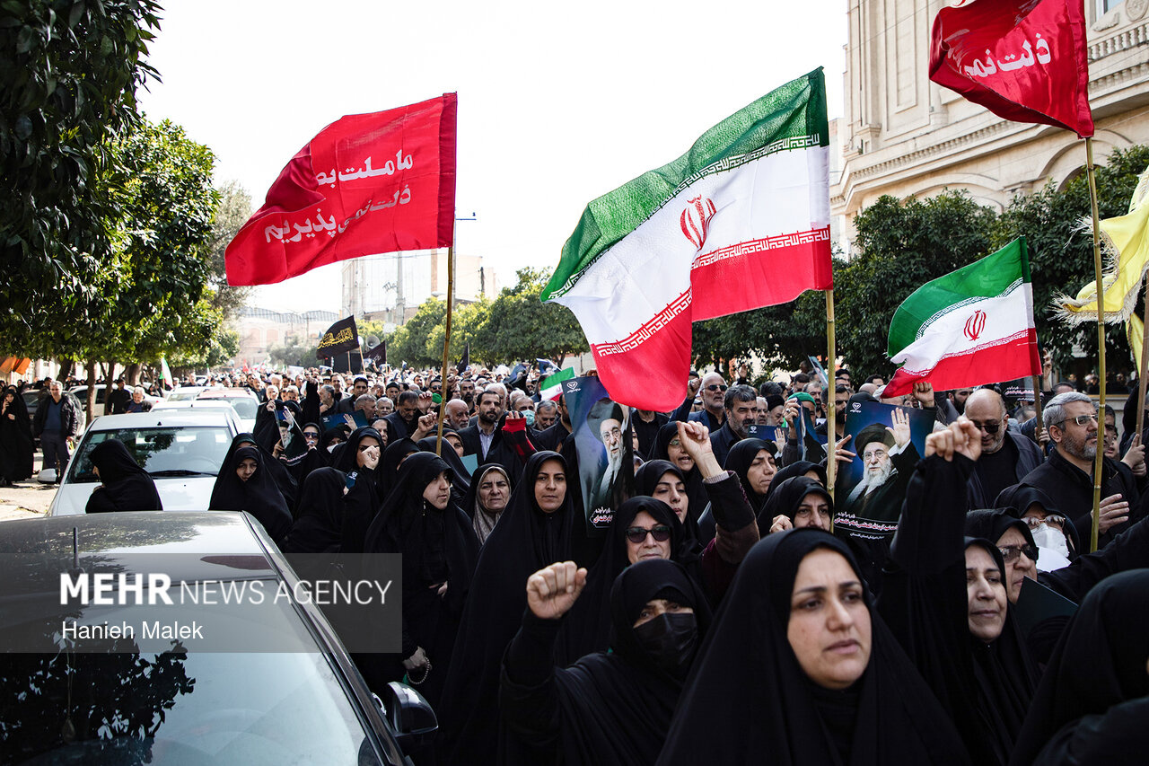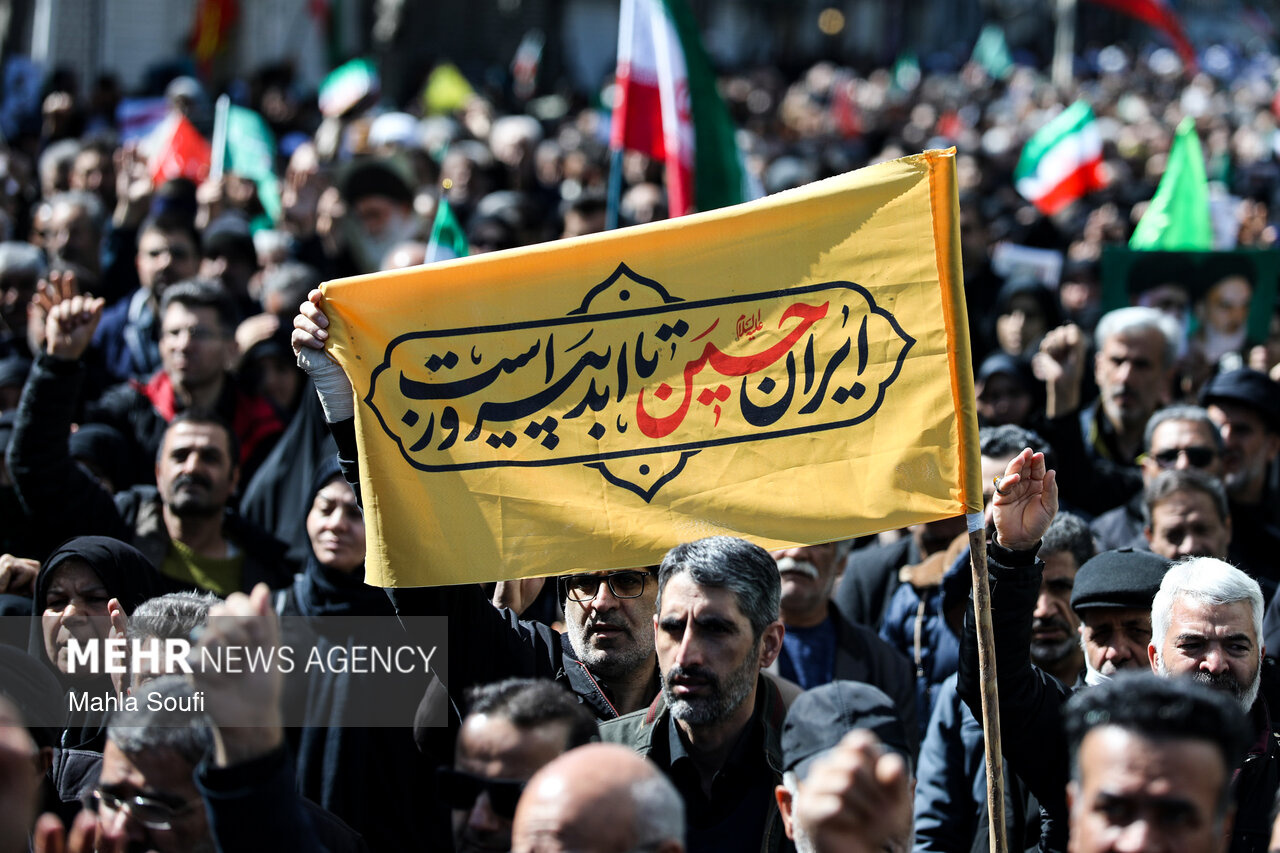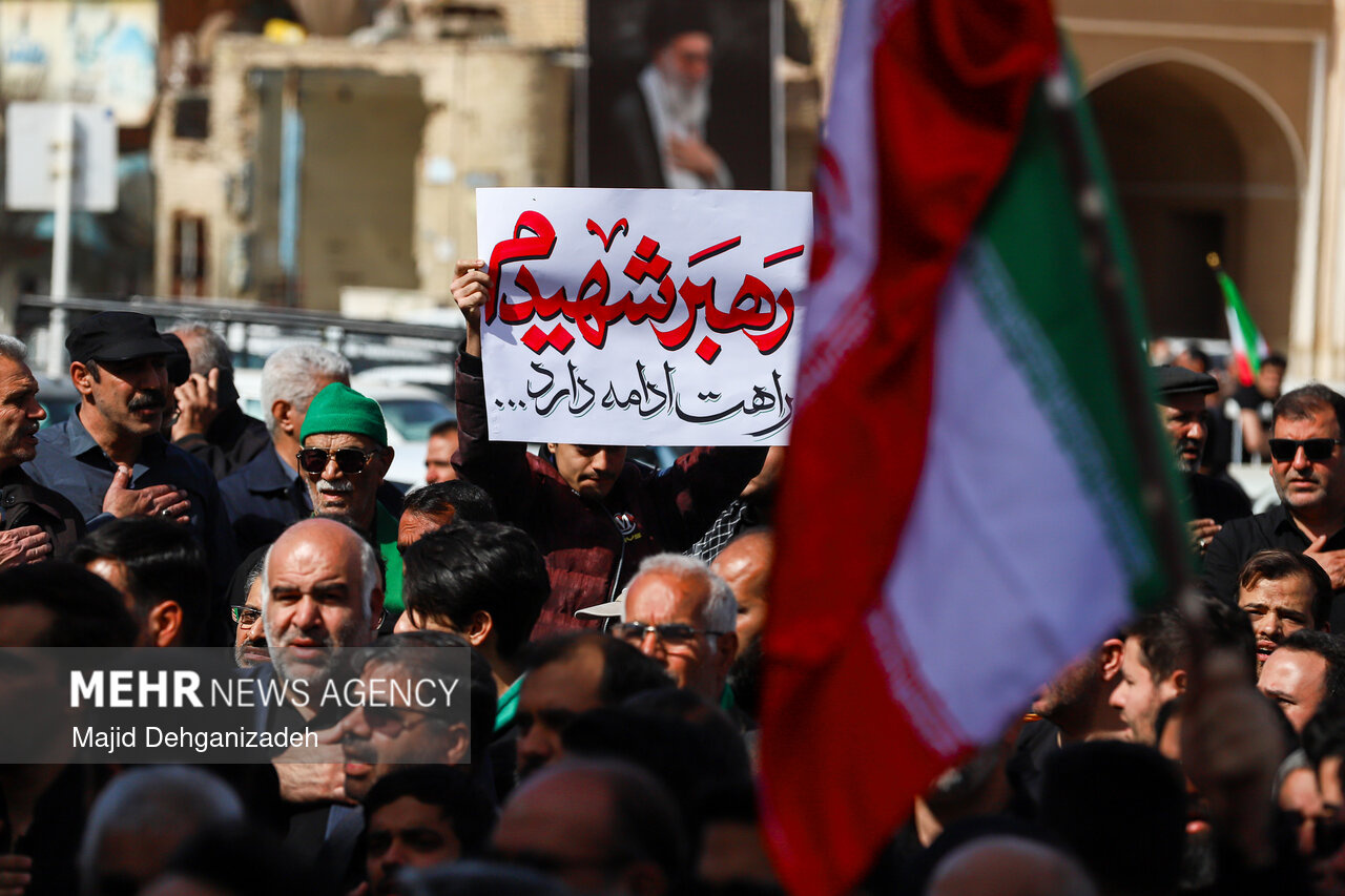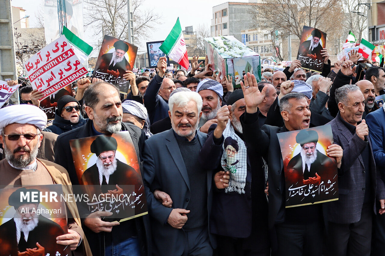 همزمان در سراسر کشور، مردم ایران پس از اقامه نماز جمعه با حضور در خیابانها ضمن اعلام خونخواهی در پی شهادت رهبر انقلاب، با برگزاری راهپیمایی سراسری اقدامات آمریکایی ـ صهیونیستی را محکوم کردند.|منبع: مهر
