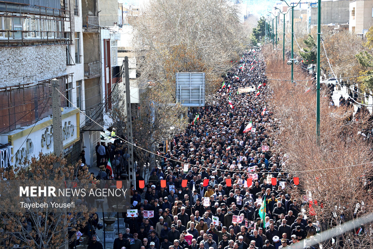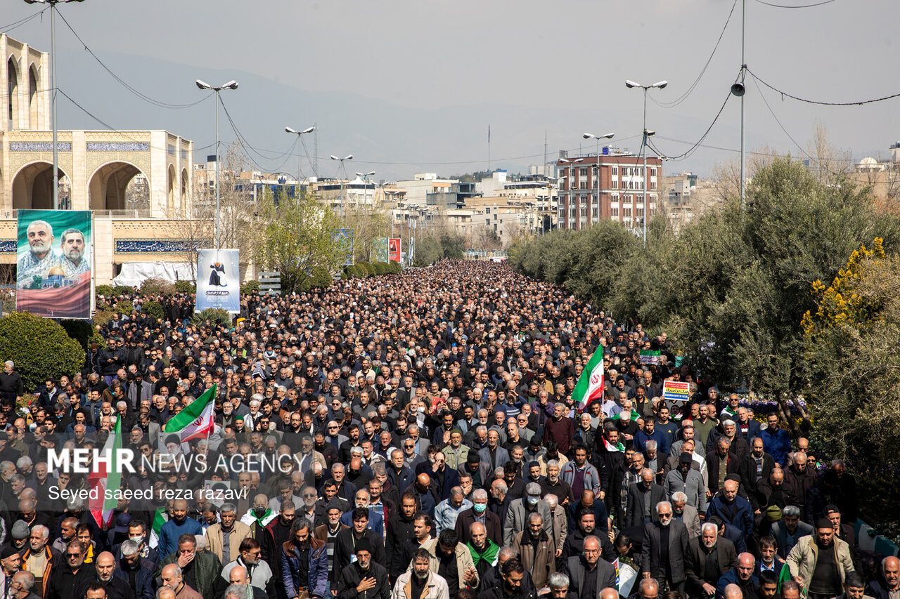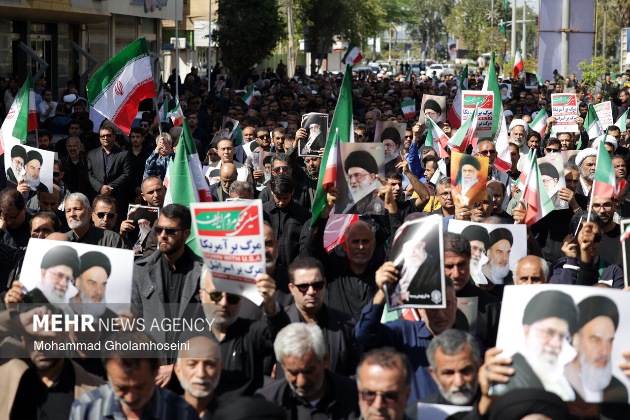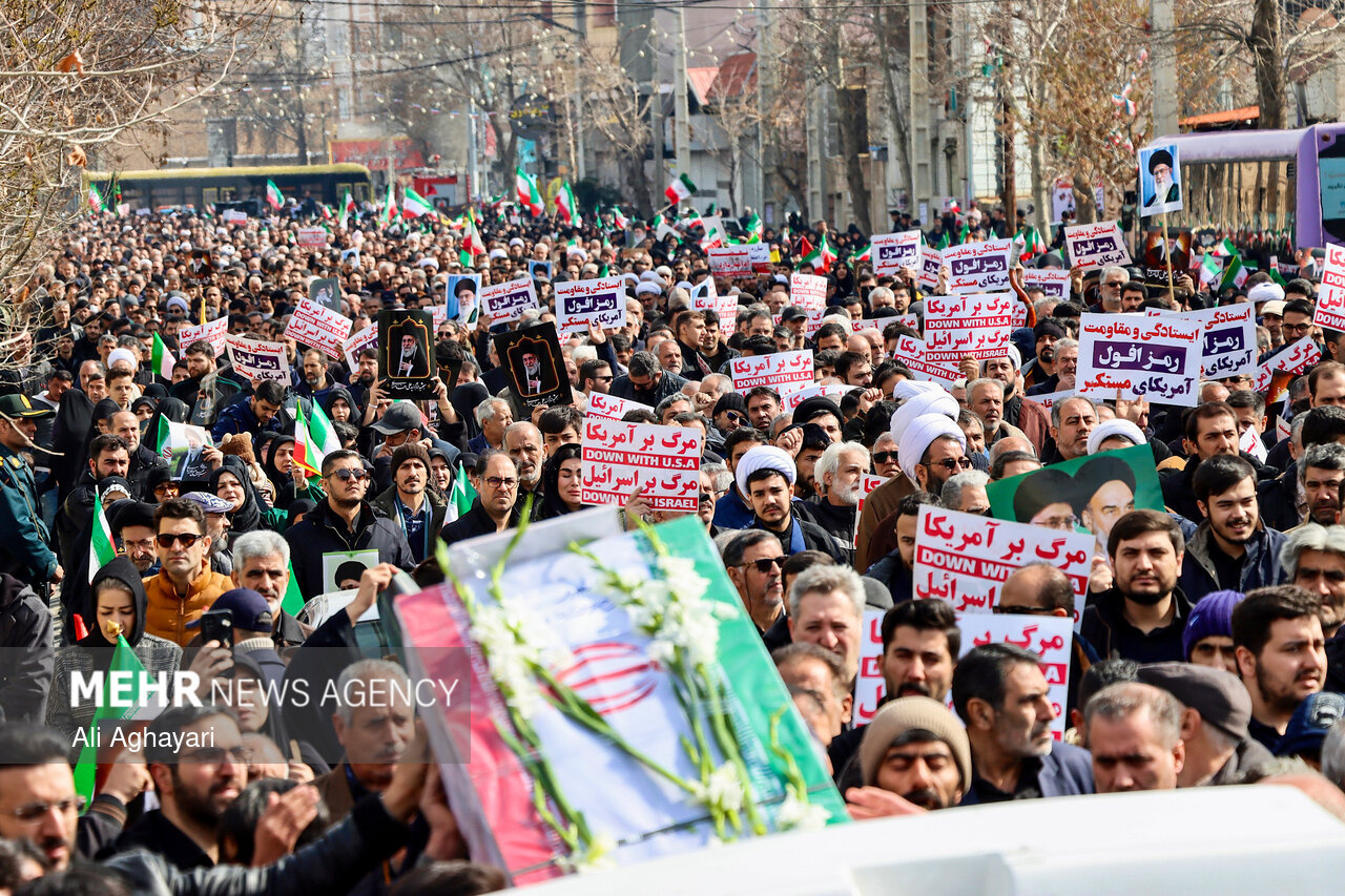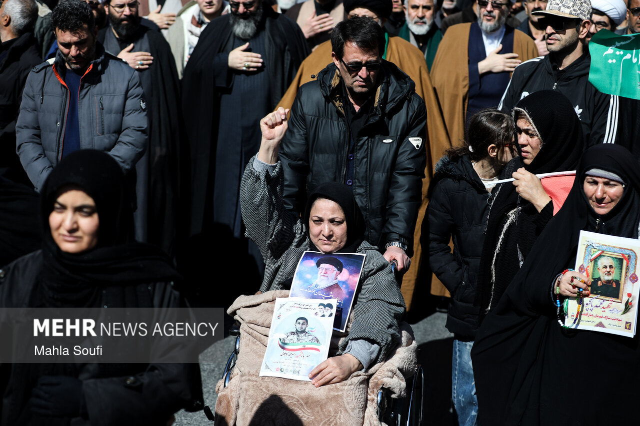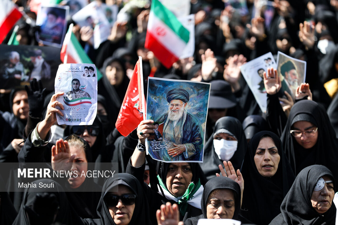 همزمان در سراسر کشور، مردم ایران پس از اقامه نماز جمعه با حضور در خیابانها ضمن اعلام خونخواهی در پی شهادت رهبر انقلاب، با برگزاری راهپیمایی سراسری اقدامات آمریکایی ـ صهیونیستی را محکوم کردند.|منبع: مهر