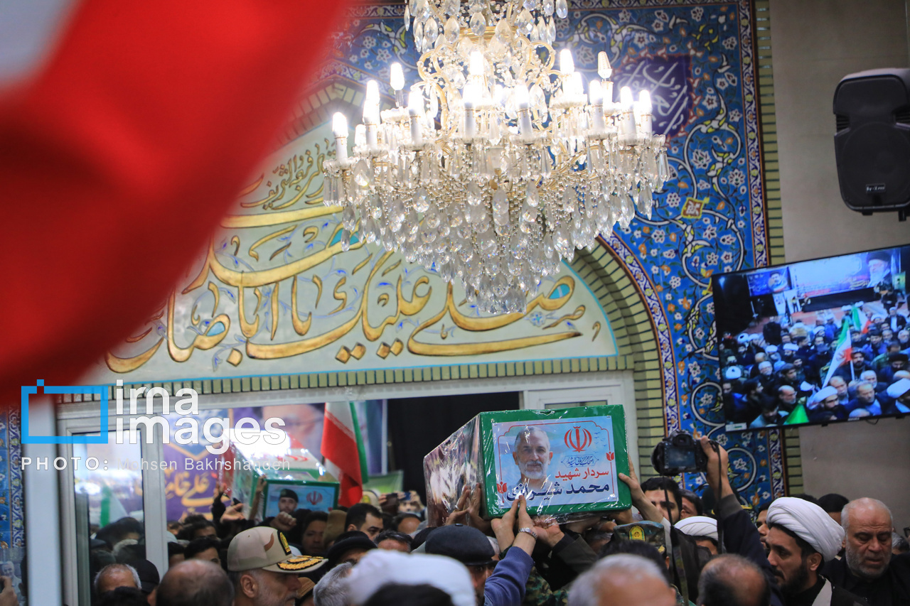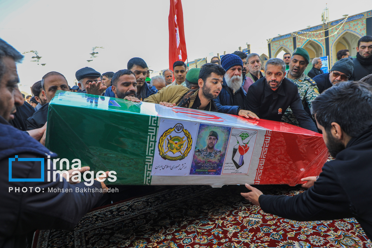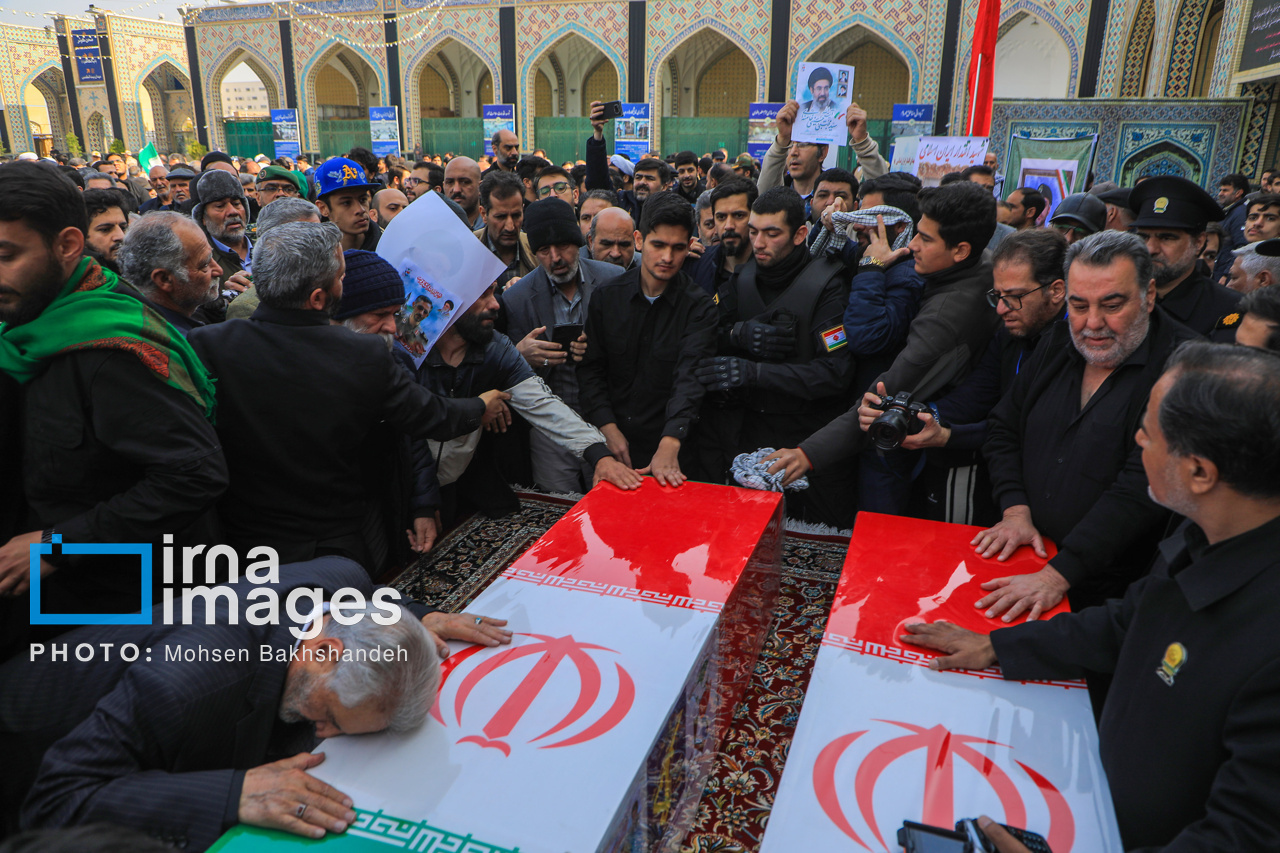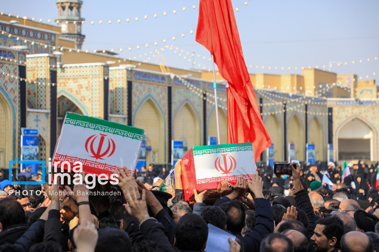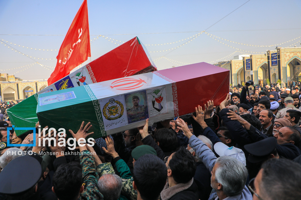 پیکر دو نفر از شهدای حمله به بیت رهبری؛ شهید سرلشکر محمد شیرازی و شهید مجتبی پارساروش که در روز نخست حمله متجاوزانه آمریکایی - اسرائیلی به شهادت رسیدند،روز یکشنبه (۲۴ اسفند ۱۴۰۴) در مشهد تشییع و در حرم رضوی به خاک سپرده شد.|منبع: ایرنا