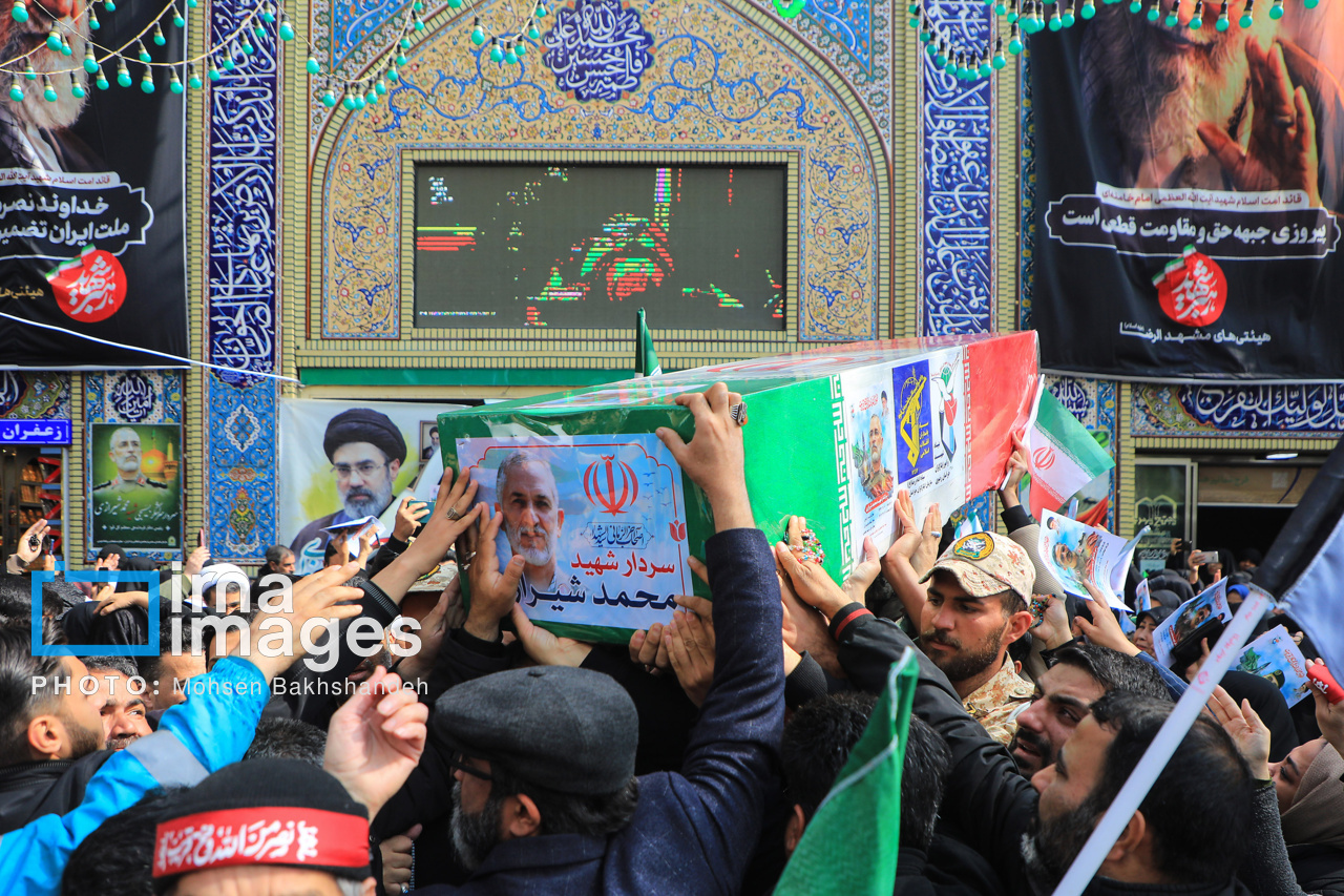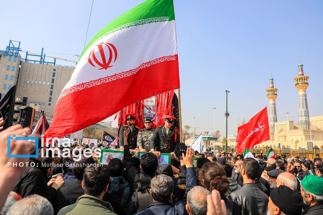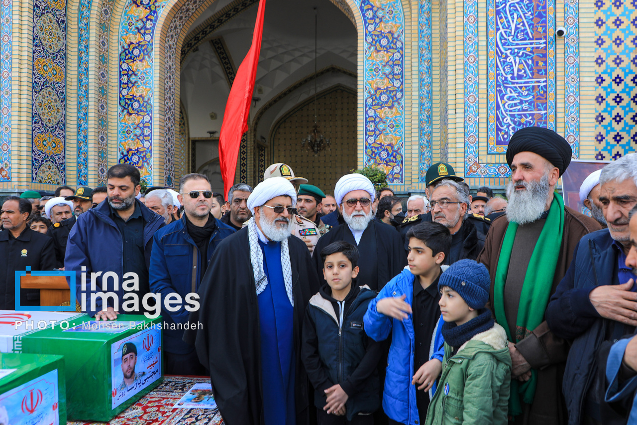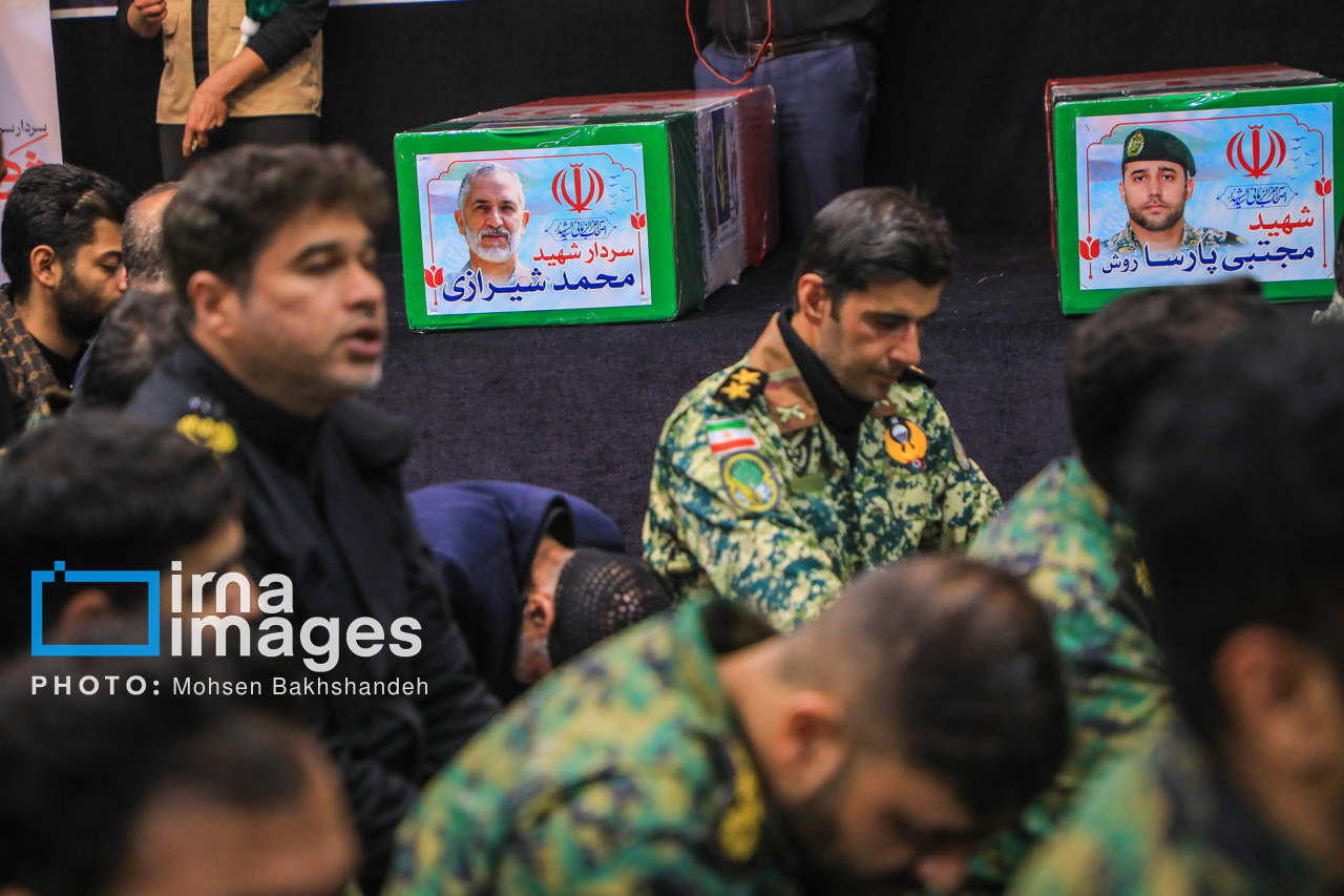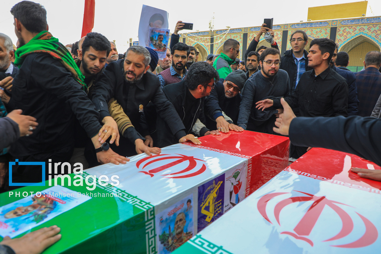 پیکر دو نفر از شهدای حمله به بیت رهبری؛ شهید سرلشکر محمد شیرازی و شهید مجتبی پارساروش که در روز نخست حمله متجاوزانه آمریکایی - اسرائیلی به شهادت رسیدند،روز یکشنبه (۲۴ اسفند ۱۴۰۴) در مشهد تشییع و در حرم رضوی به خاک سپرده شد.|منبع: ایرنا