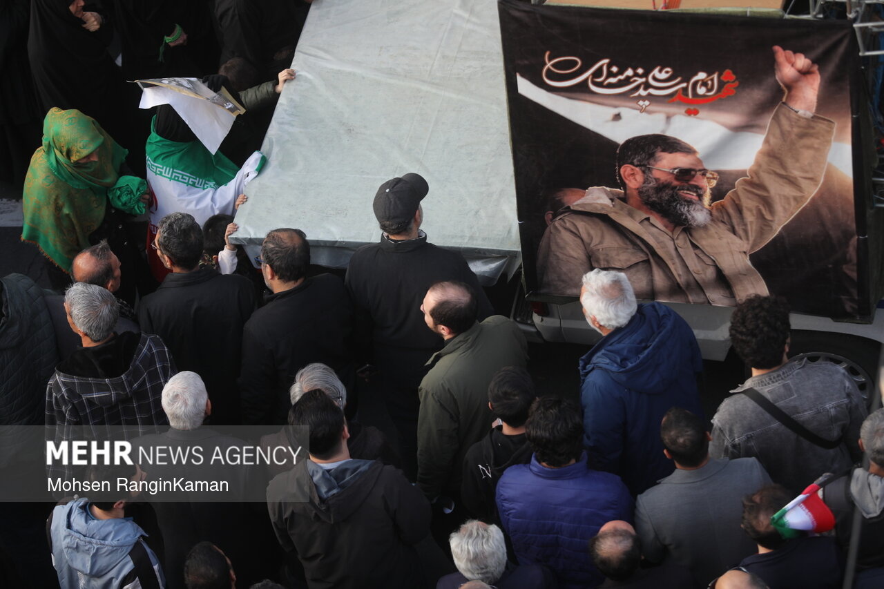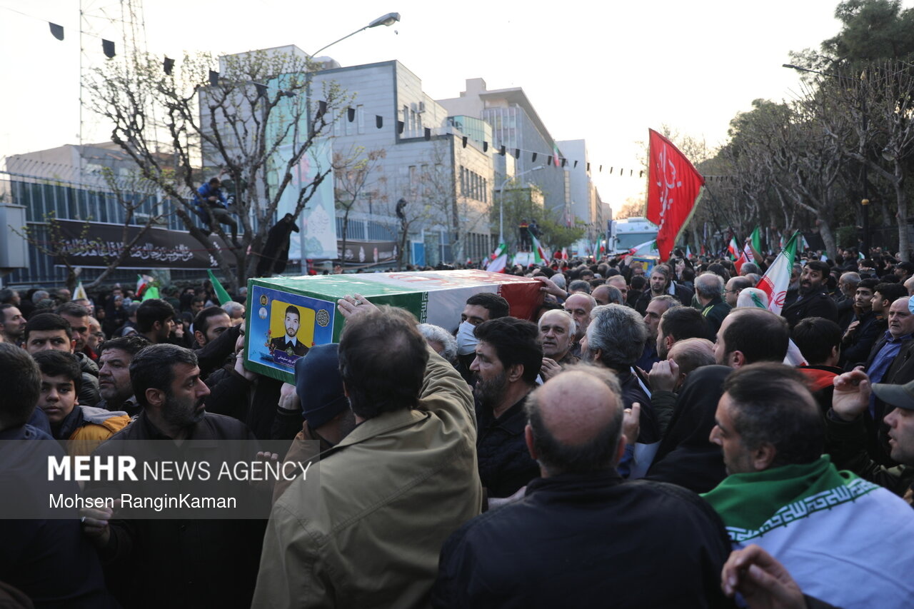 مراسم تشییع شهیدان علی لاریجانی دبیر شورای عالی امنیت ملی، سردار سرلشکر غلامرضا سلیمانی رئیس سازمان بسیج مستضعفین و شهدای ناوشکن دنا امروز چهارشنبه از میدان انقلاب تهران به سمت معراج شهدا برگزار شد.|منبع: مهر