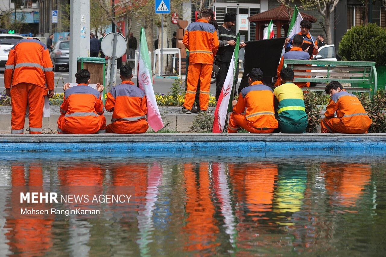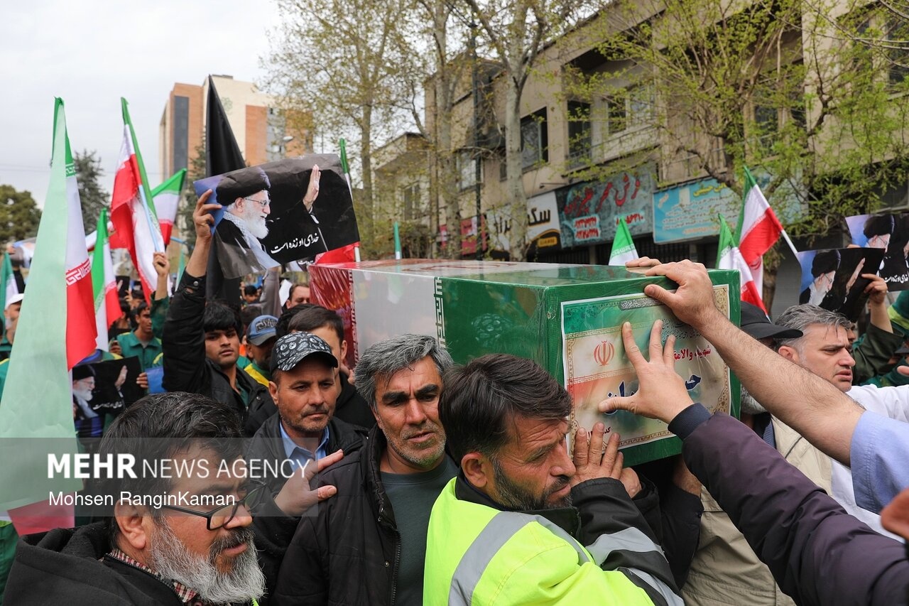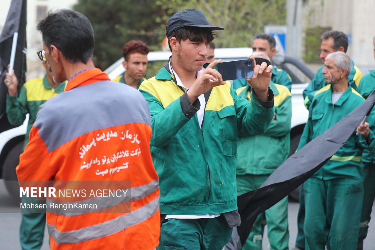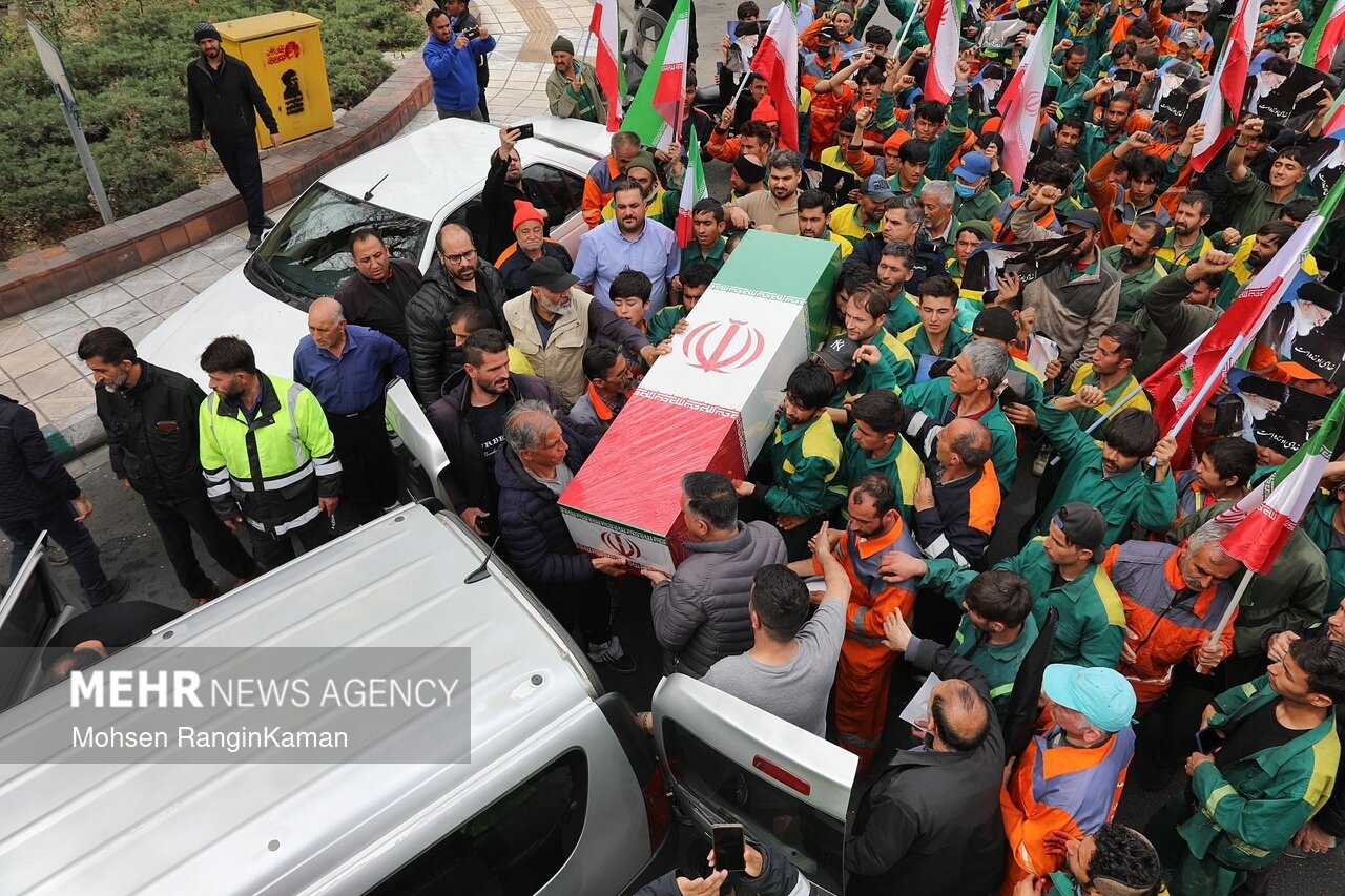 پیکر مطهر شهید حسن خیران؛ یکی از پاکبانان تهرانی که در حملات هوایی آمریکایی- صهیونی به شهادت رسید، دوشنبه ۳ فروردین ۱۴۰۳ با حضور پرشمار مردم و همکارانش در میدان سیدجمالالدین اسدآبادی تهران تشییع شد. / منبع: مهر