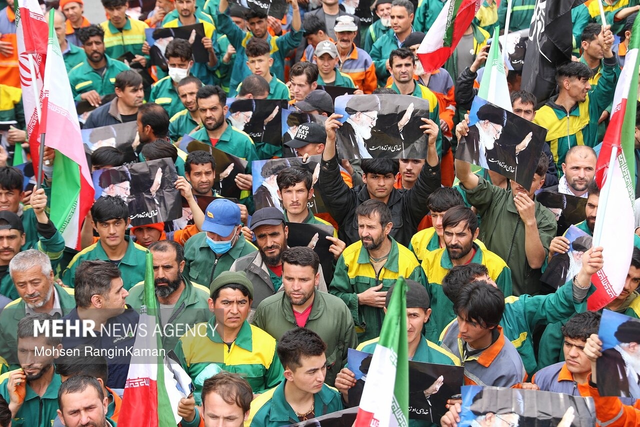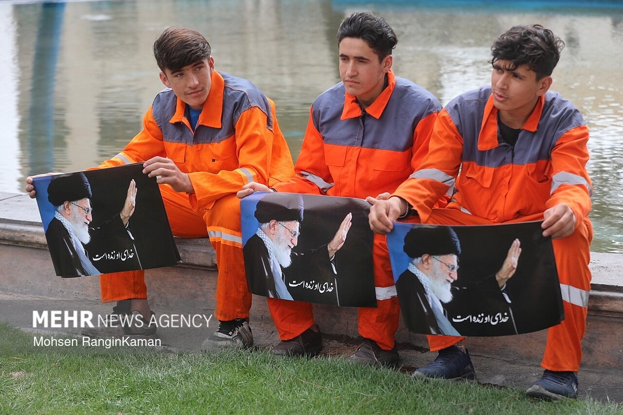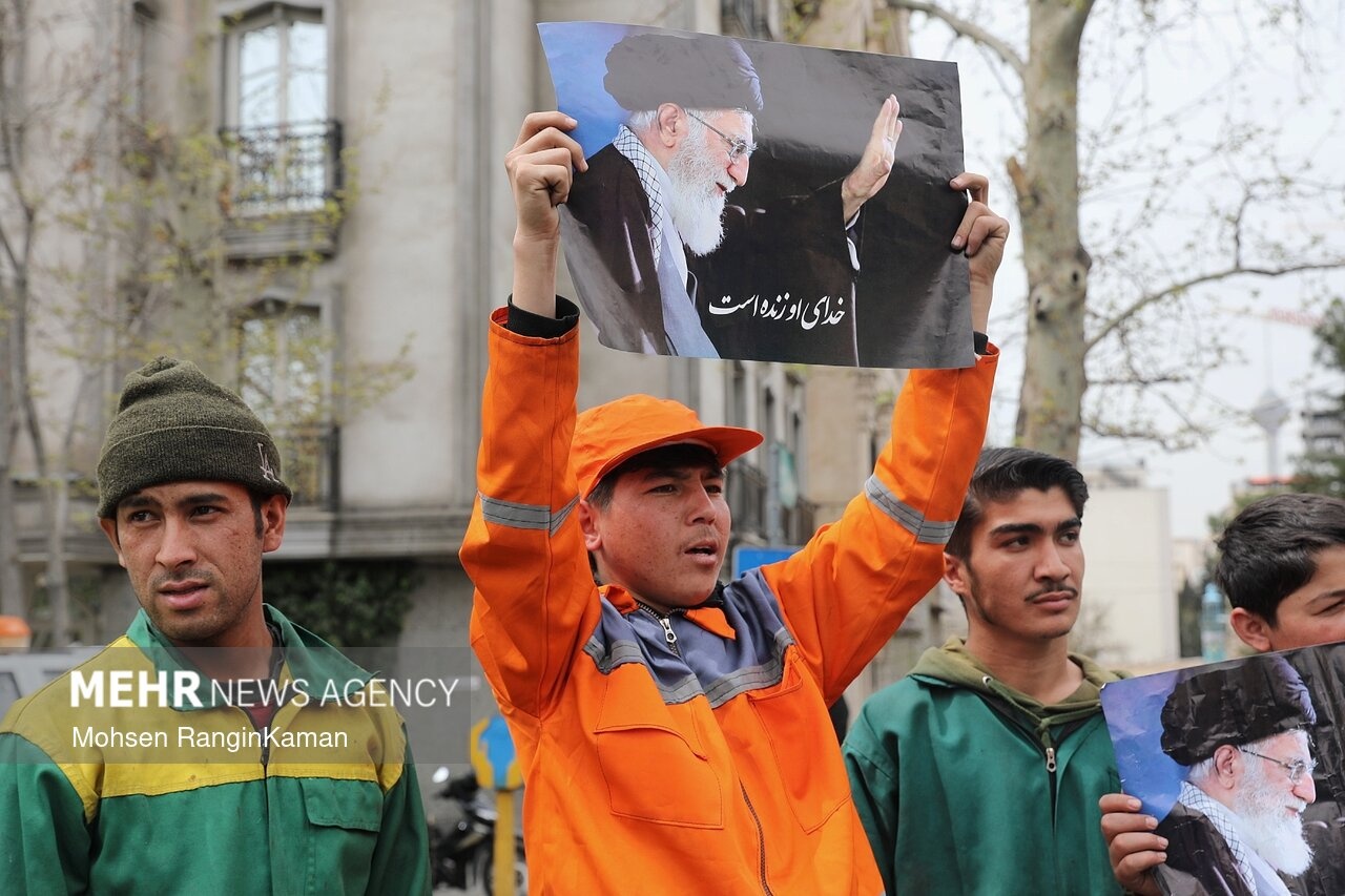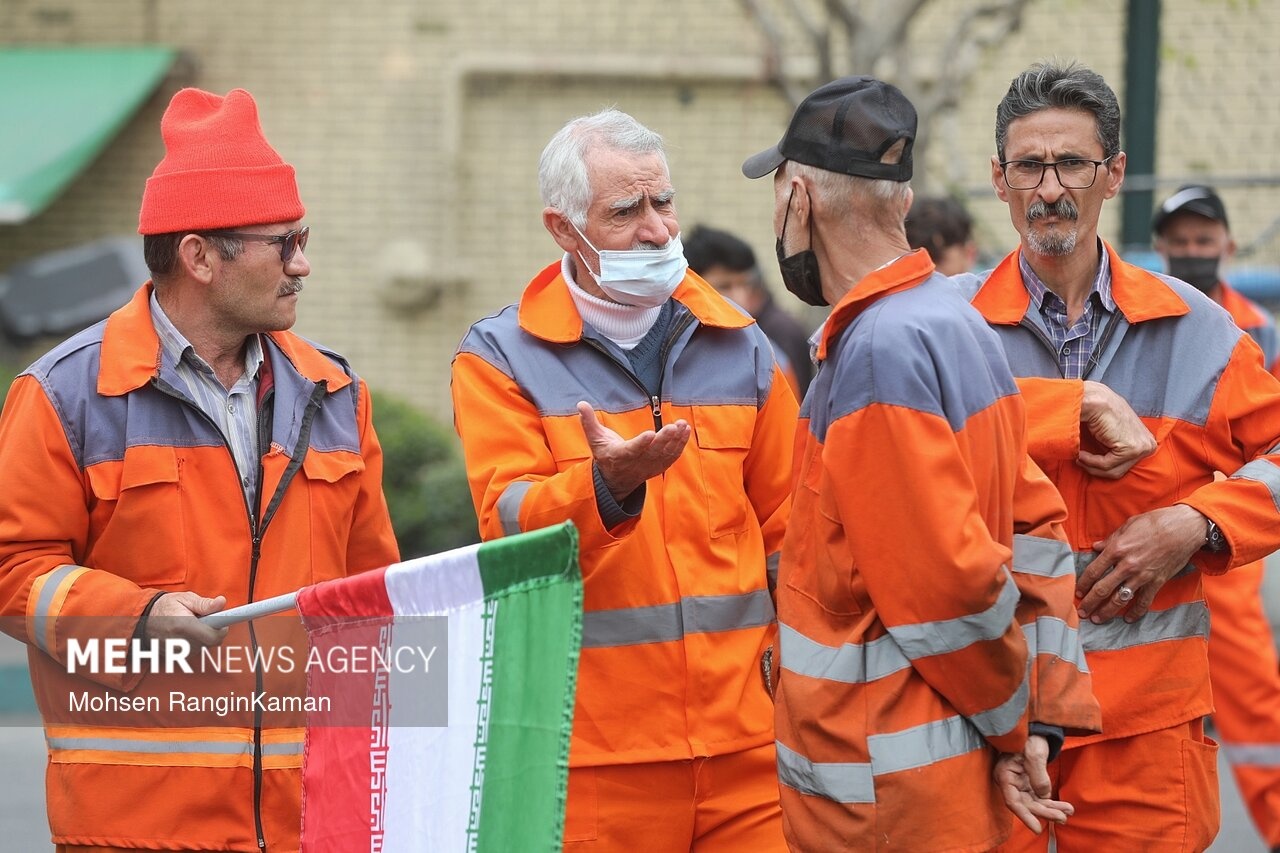 پیکر مطهر شهید حسن خیران؛ یکی از پاکبانان تهرانی که در حملات هوایی آمریکایی- صهیونی به شهادت رسید، دوشنبه ۳ فروردین ۱۴۰۳ با حضور پرشمار مردم و همکارانش در میدان سیدجمالالدین اسدآبادی تهران تشییع شد. / منبع: مهر