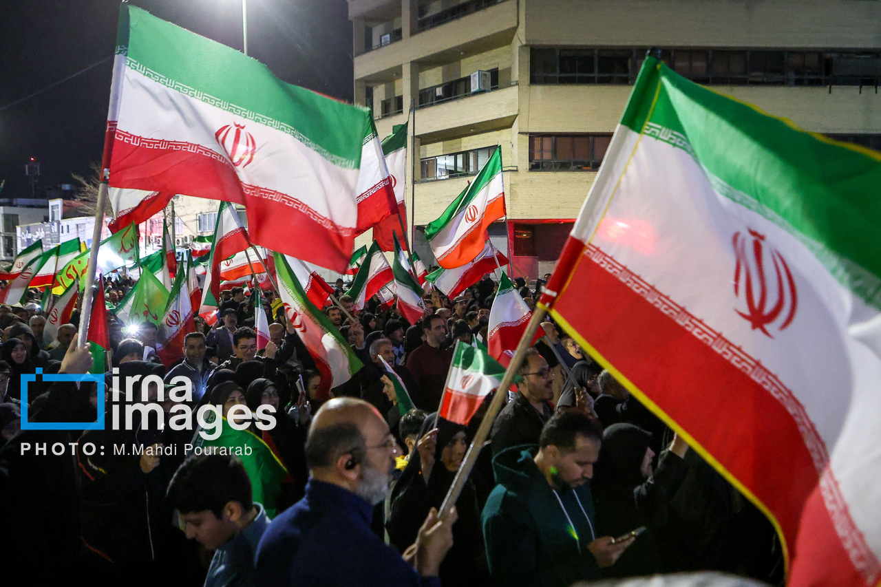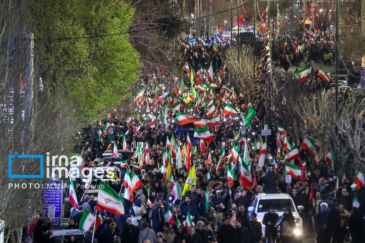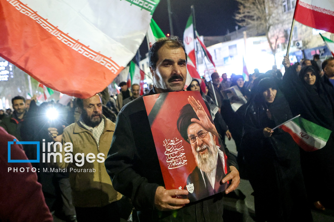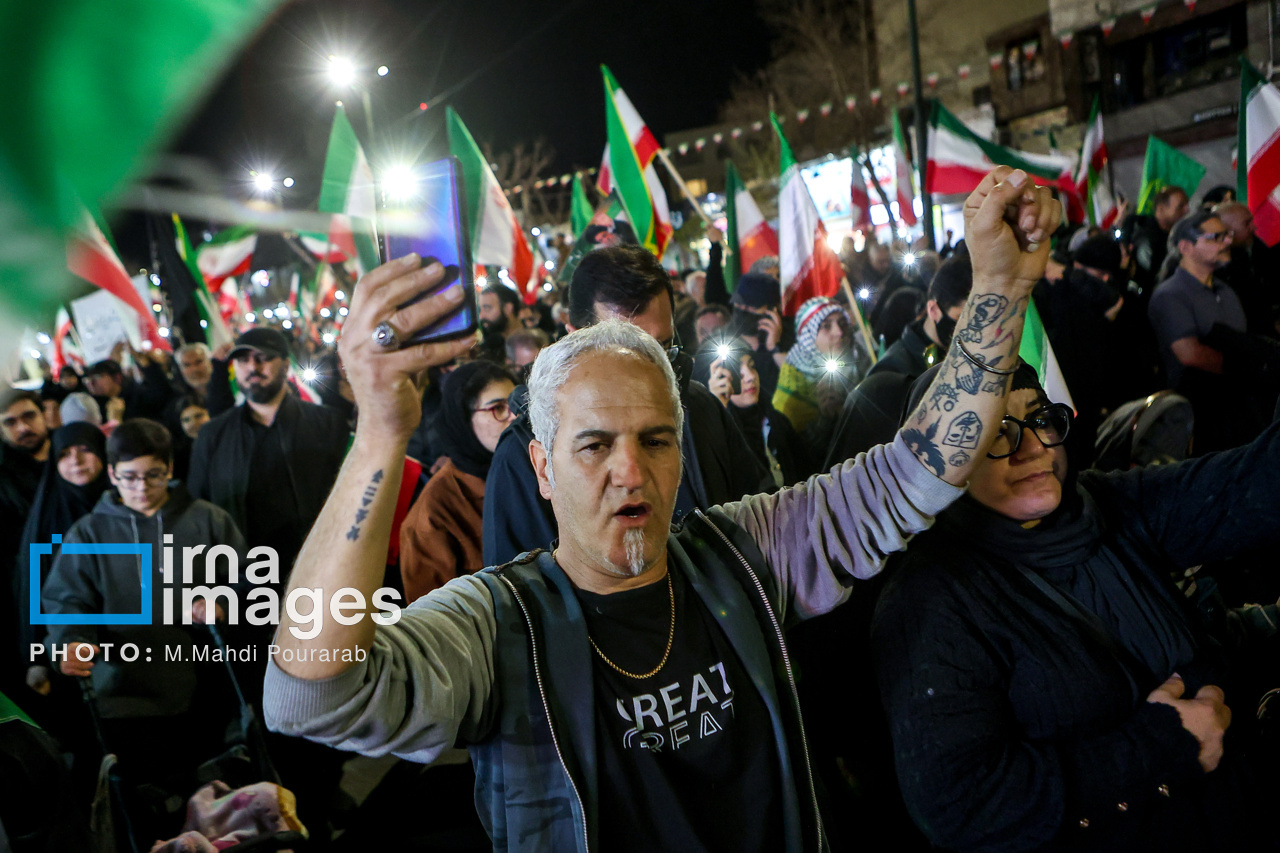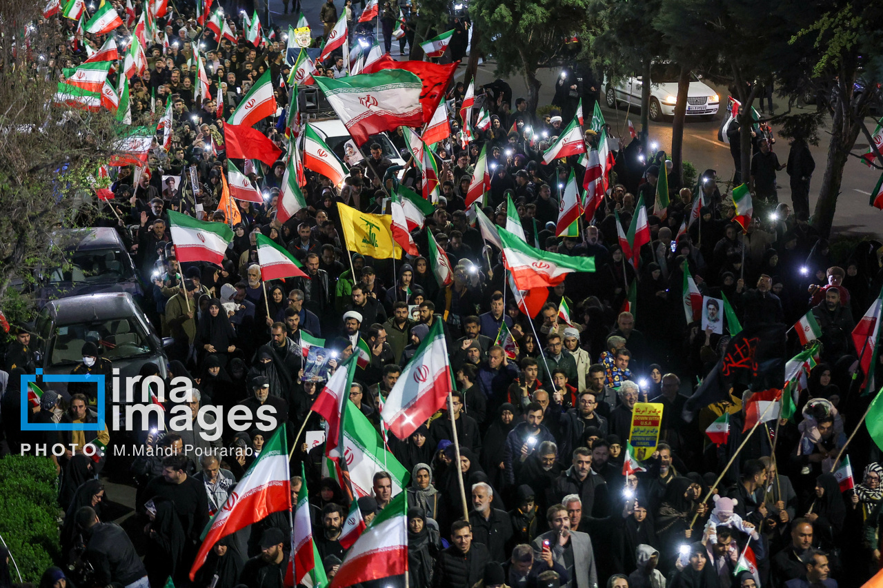 میدان آزادگان کرج شامگاه سه شنبه (۴ فروردین ۱۴۰۴) میزبان سیل خروشان مردمی بود که در بیست و چهارمین شب از راهپیماییهای شبانه و عطش انتقام از دشمن، به چهارراه هفت تیر سرازیر شدند و صحنهای از وحدت و انسجام ملی را به نمایش گذاشتند.|منبع: ایرنا