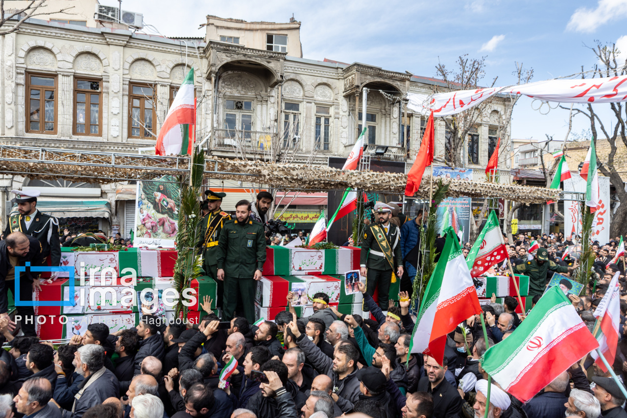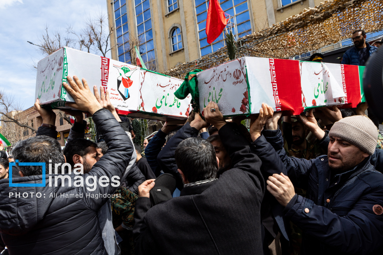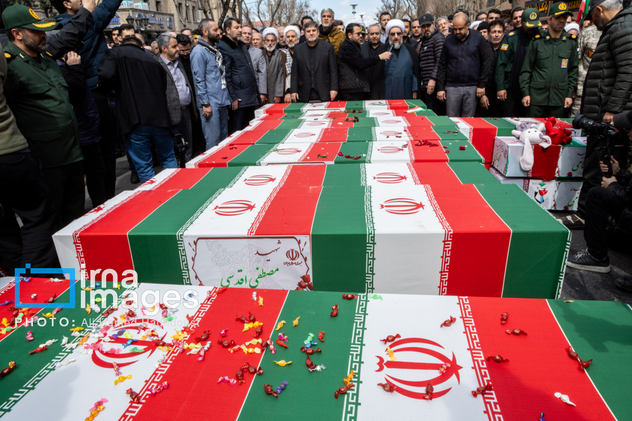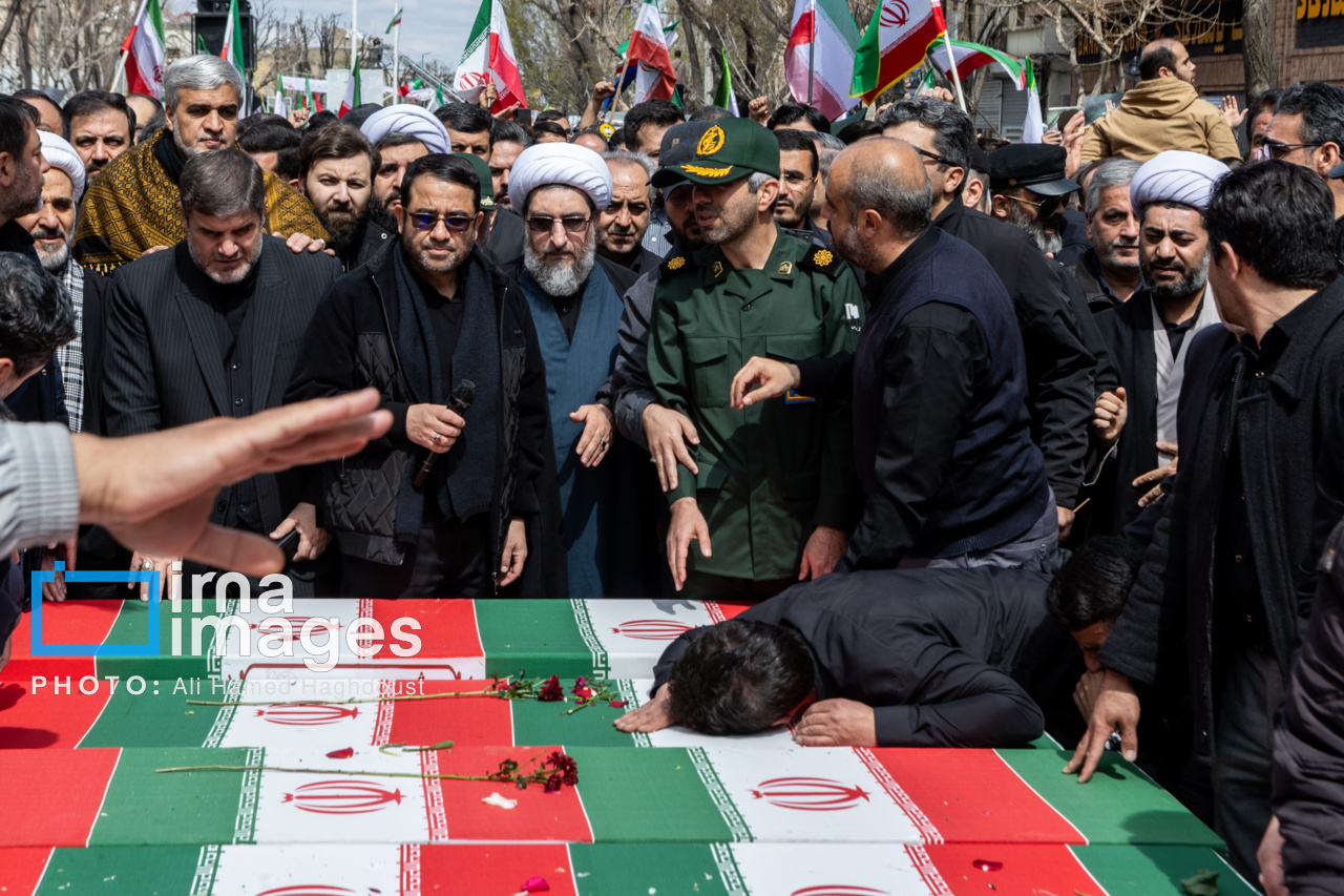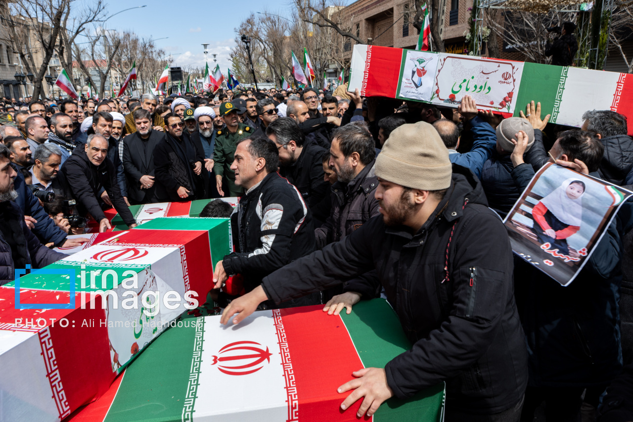 پیکر مطهر ۲۱ شهید حملات صهیونیستی _آمریکایی روز پنجشنبه (۶ فروردین ۱۴۰۵) با حضور پرشور مردم از میدان شهدا تا خیابان ارتش جنوبی تبریز تشییع شدند.|منبع: ایرنا