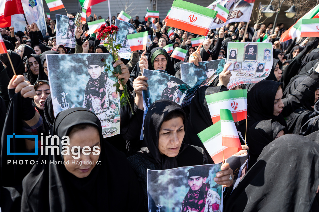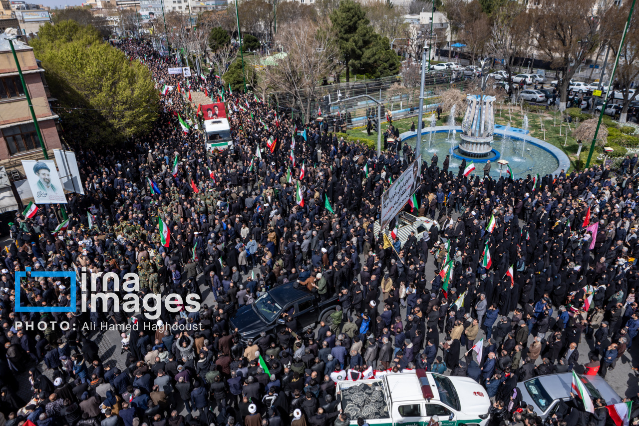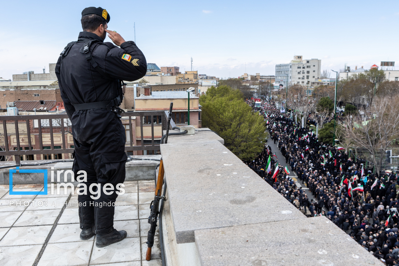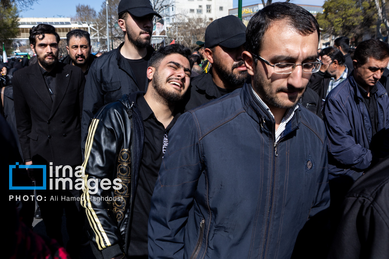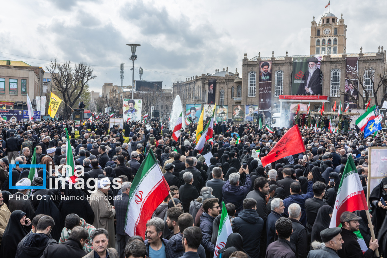 پیکر مطهر ۲۱ شهید حملات صهیونیستی _آمریکایی روز پنجشنبه (۶ فروردین ۱۴۰۵) با حضور پرشور مردم از میدان شهدا تا خیابان ارتش جنوبی تبریز تشییع شدند.|منبع: ایرنا
