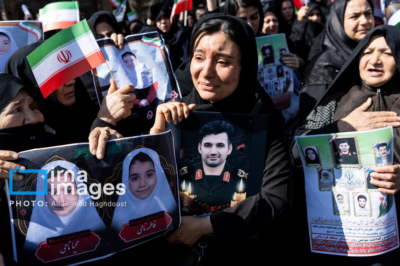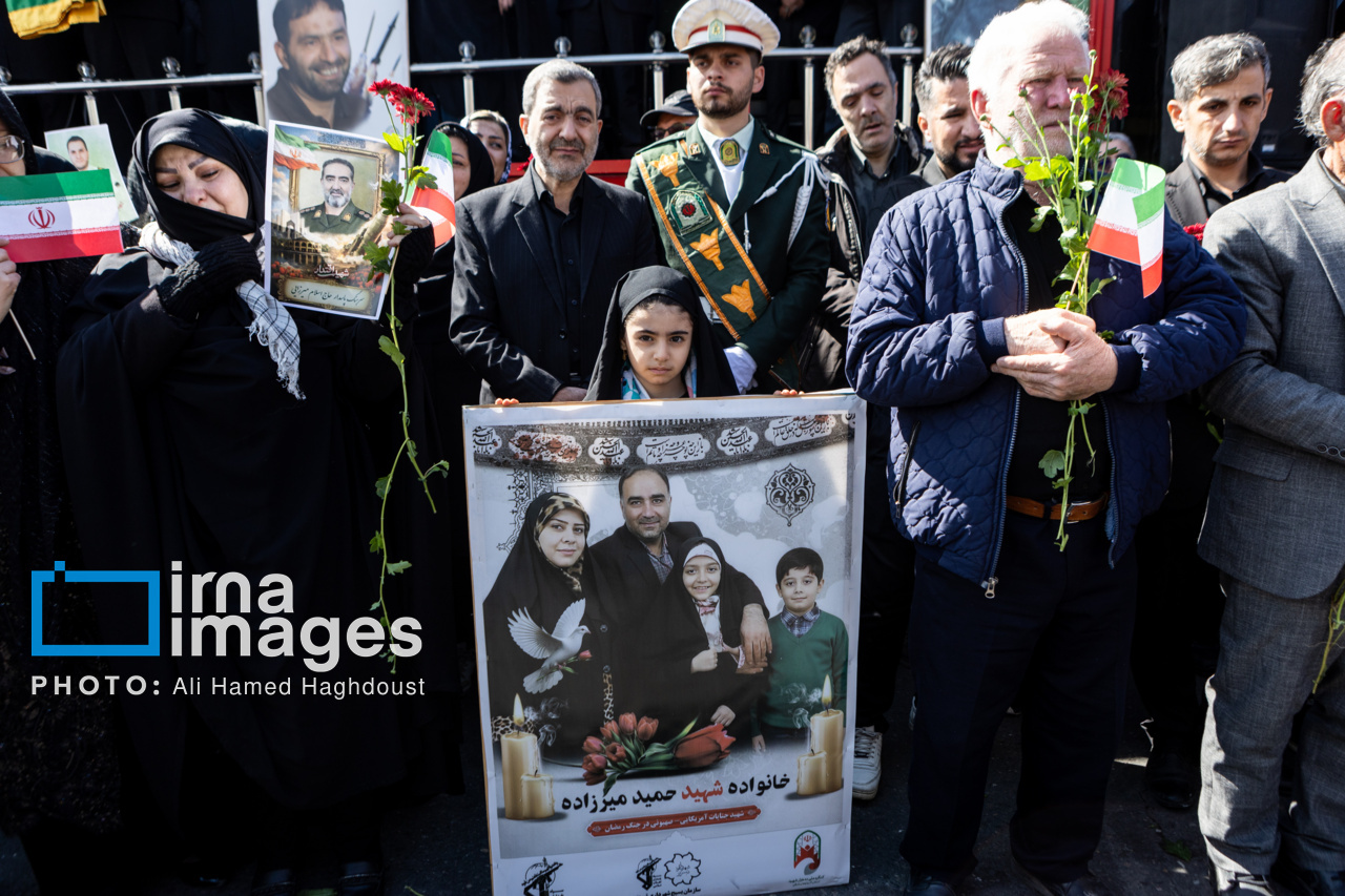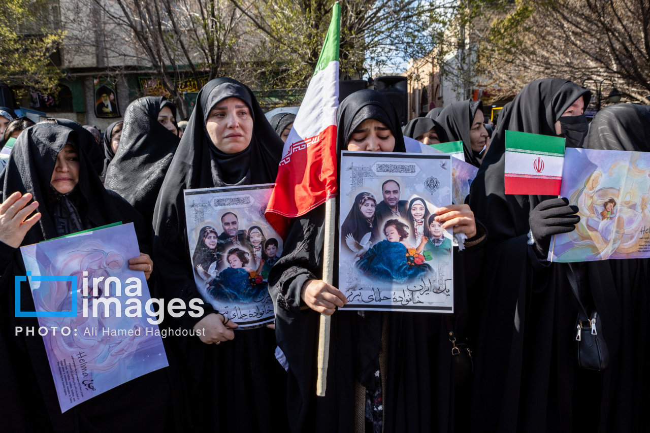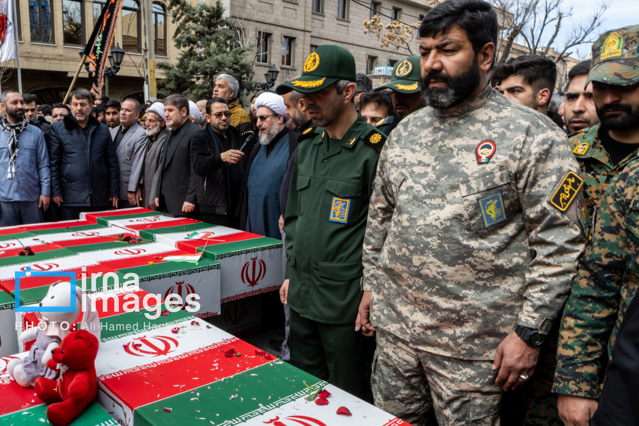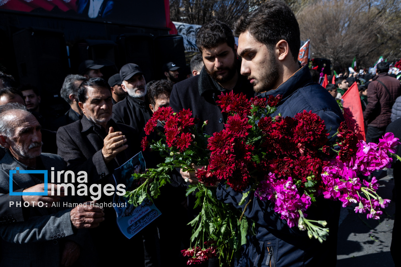 پیکر مطهر ۲۱ شهید حملات صهیونیستی _آمریکایی روز پنجشنبه (۶ فروردین ۱۴۰۵) با حضور پرشور مردم از میدان شهدا تا خیابان ارتش جنوبی تبریز تشییع شدند.|منبع: ایرنا