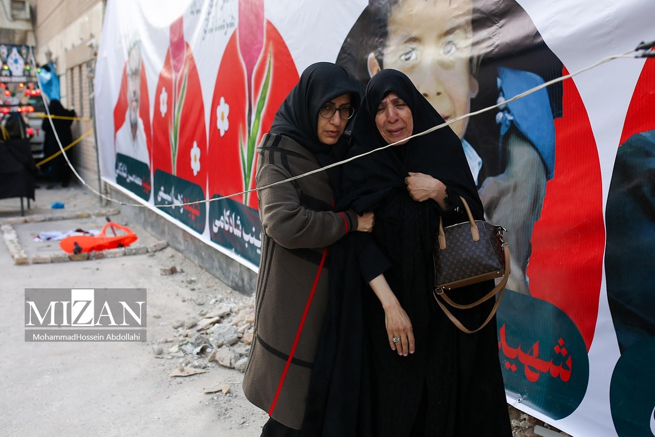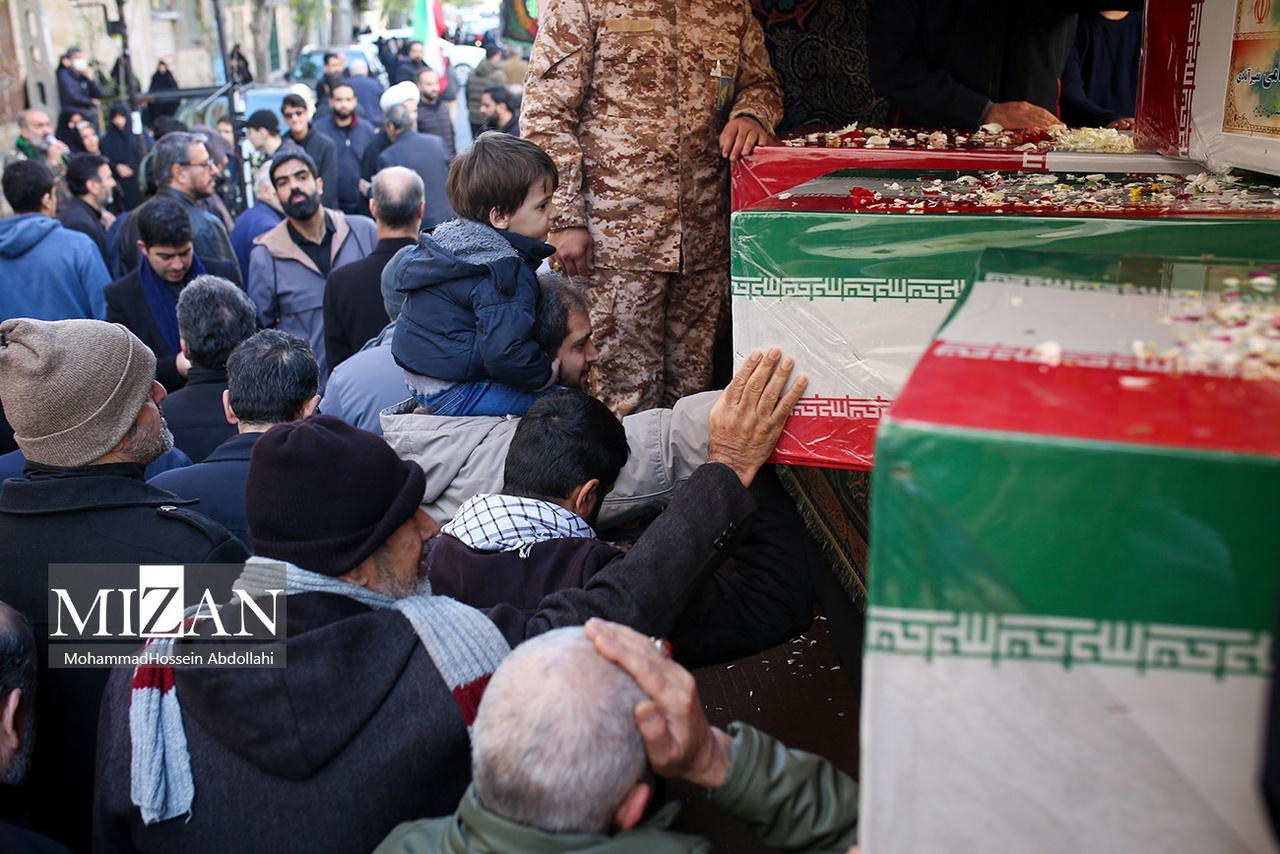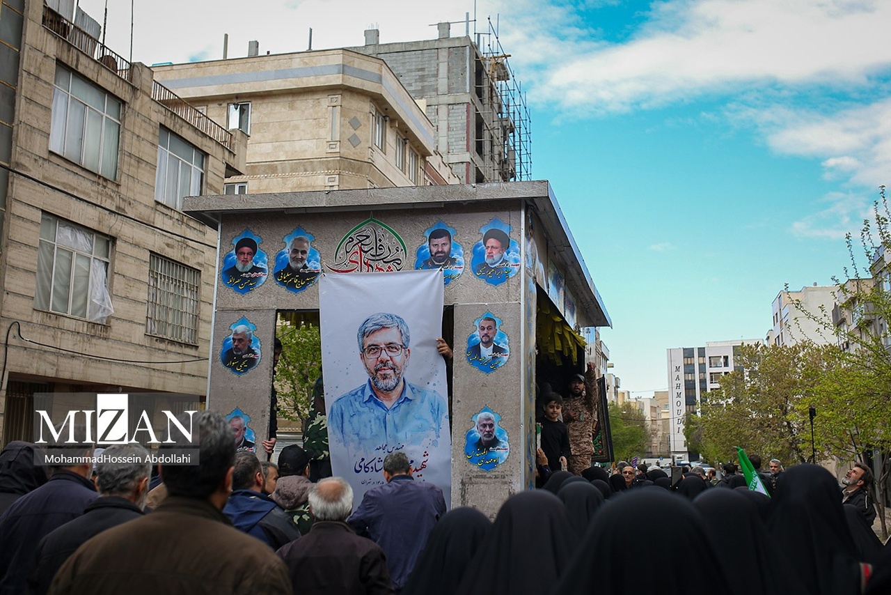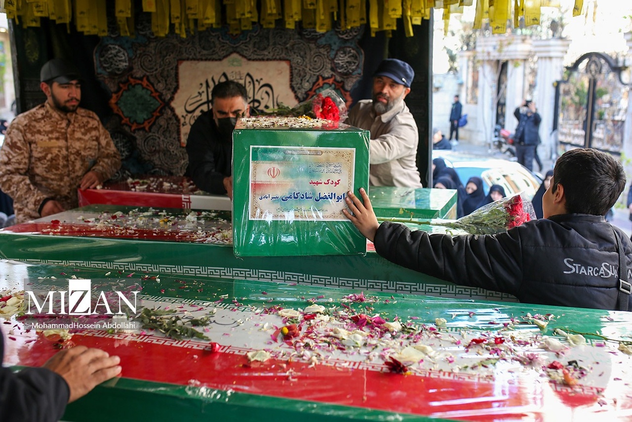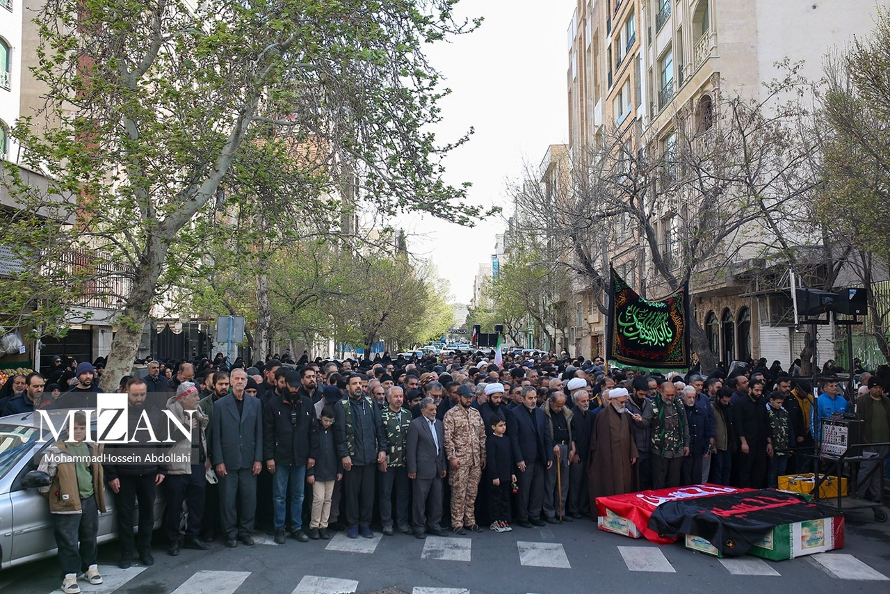 مراسم تشییع پیکرهای شهیدان محمدحسین شادکامی، شهیده زهرا سبعی، زینب شادکامی ۱۳ ساله و ابوالفضل شادکامی ۷ ساله روز دوشنبه (۱۰ فروردین ۱۴۰۵) با حضور گسترده مردم در خیابان دماوند تهران برگزار شد.|منبع: میزان