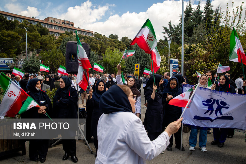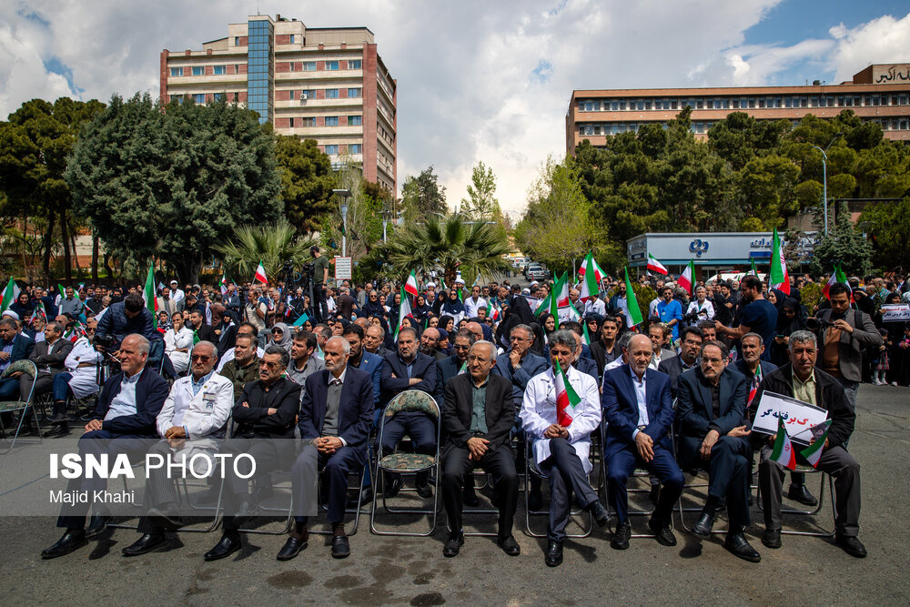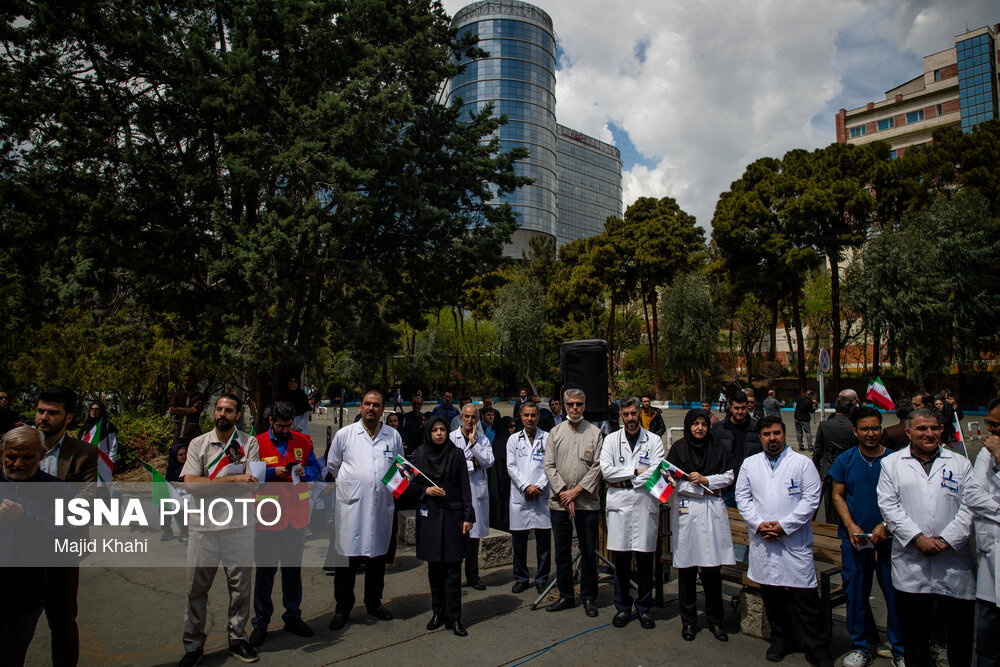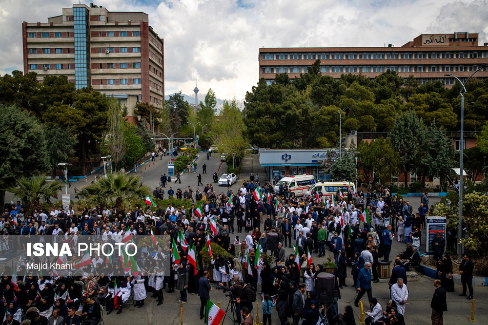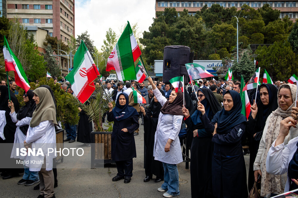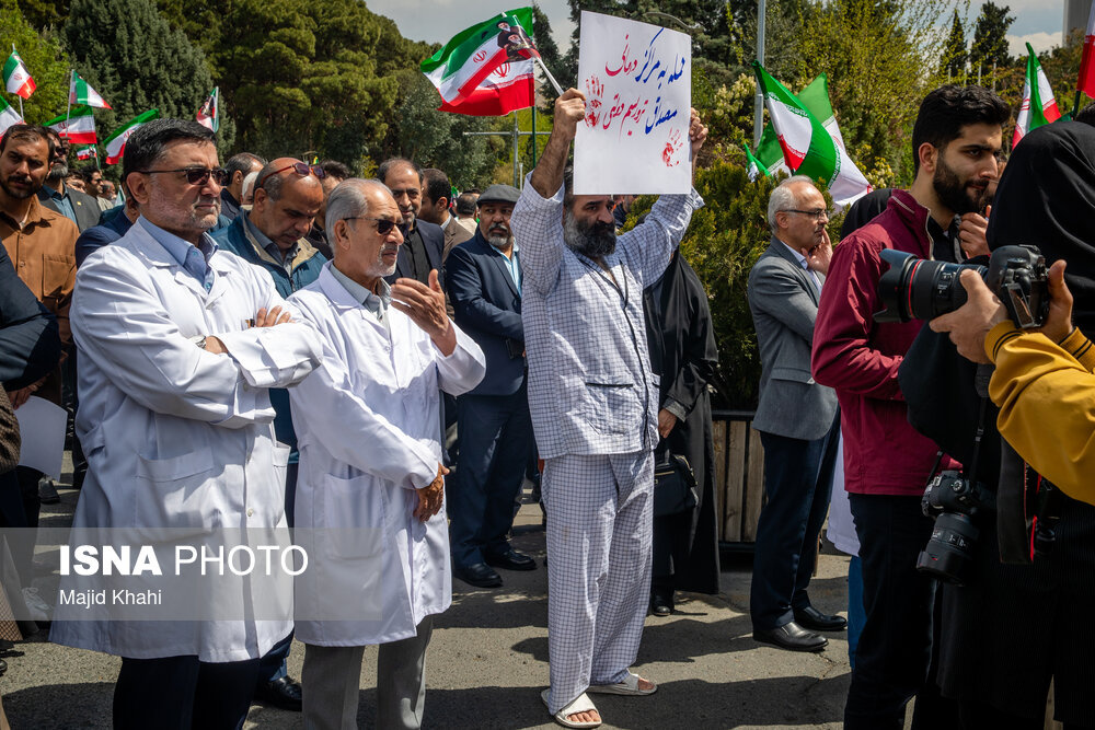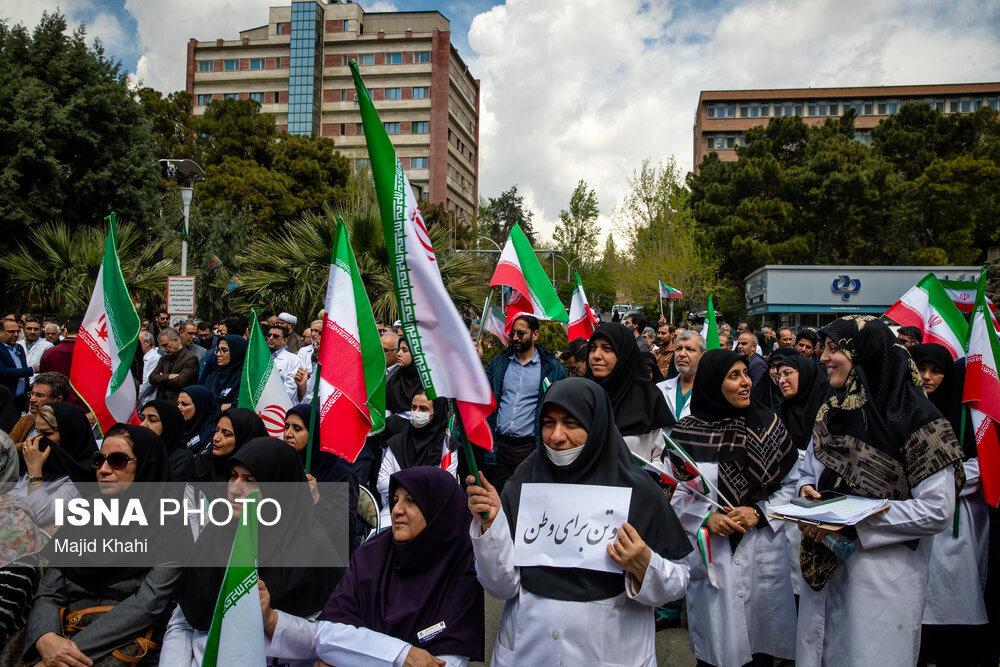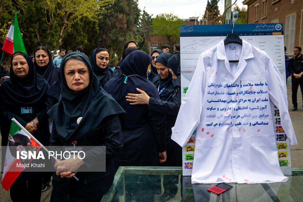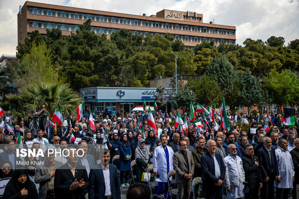 تجمع اعتراضی دانشگاهیان و کادر سلامت در محکومیت حملات آمریکا و رژیم صهیونیستی به مراکز بهداشتی، درمانی و آموزشی دوشنبه ۱۷ فروردین ۱۴۰۵ در محل بیمارستان امام خمینی (ره) برگزار شد.|منبع: ایسنا