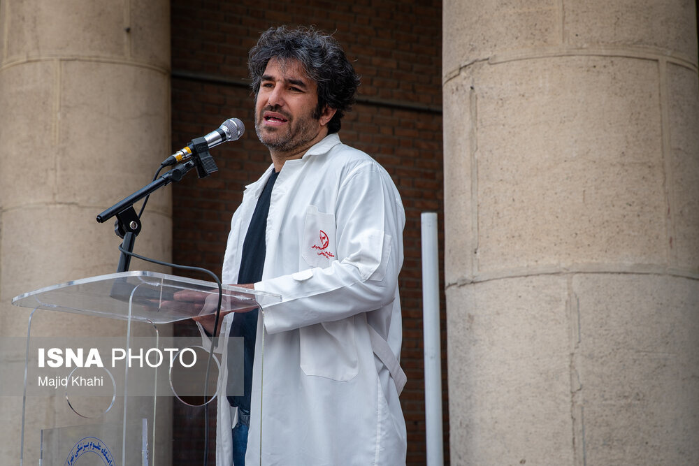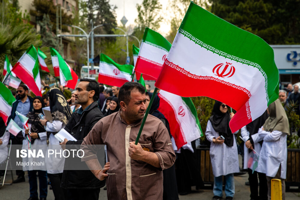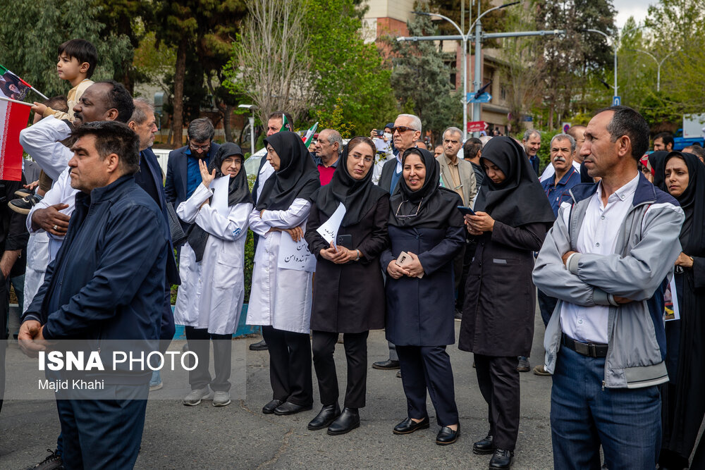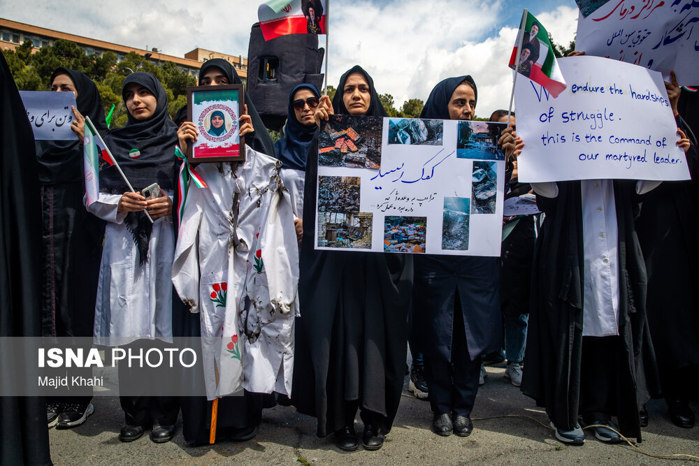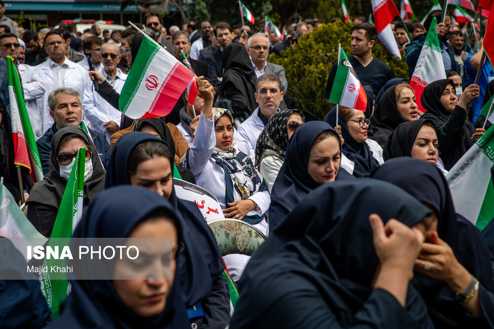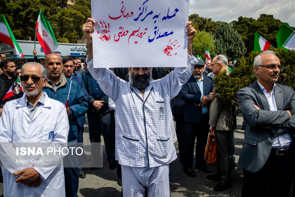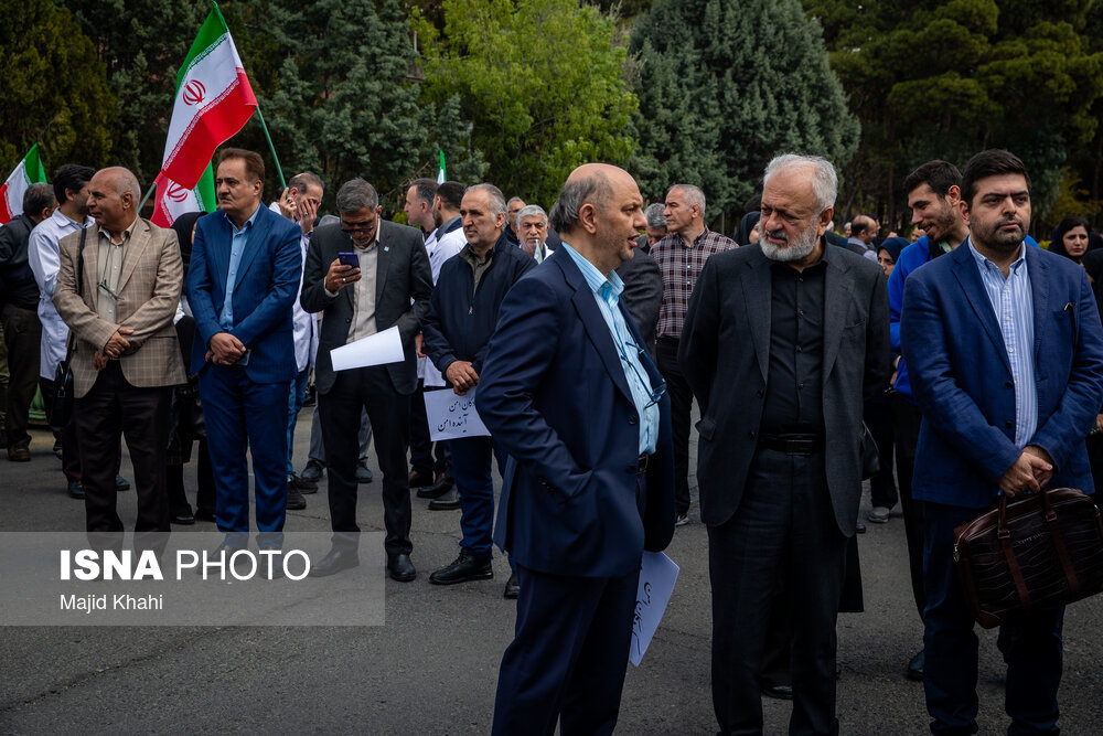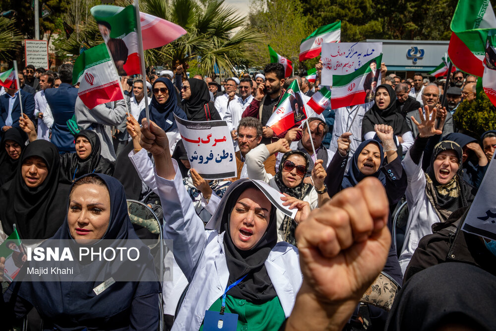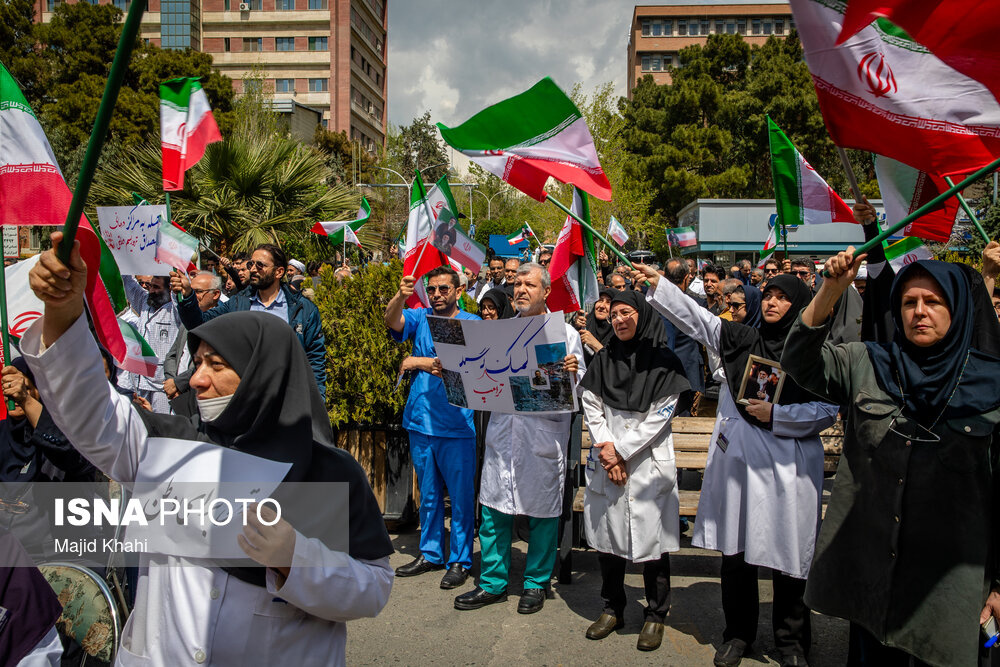 تجمع اعتراضی دانشگاهیان و کادر سلامت در محکومیت حملات آمریکا و رژیم صهیونیستی به مراکز بهداشتی، درمانی و آموزشی دوشنبه ۱۷ فروردین ۱۴۰۵ در محل بیمارستان امام خمینی (ره) برگزار شد.|منبع: ایسنا
