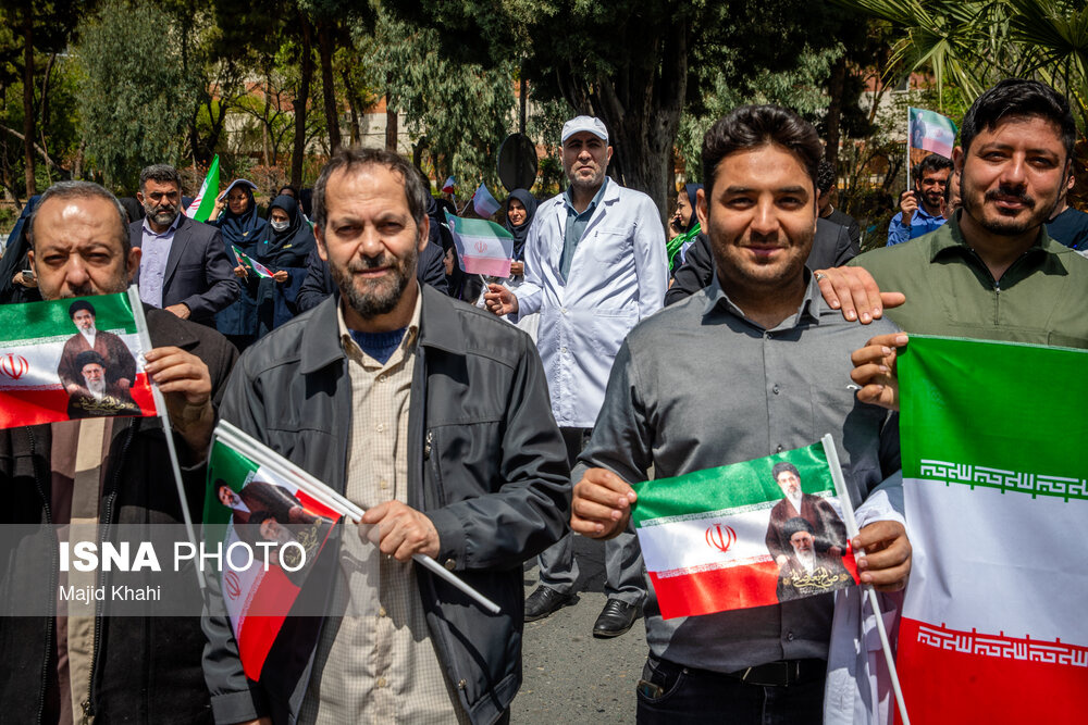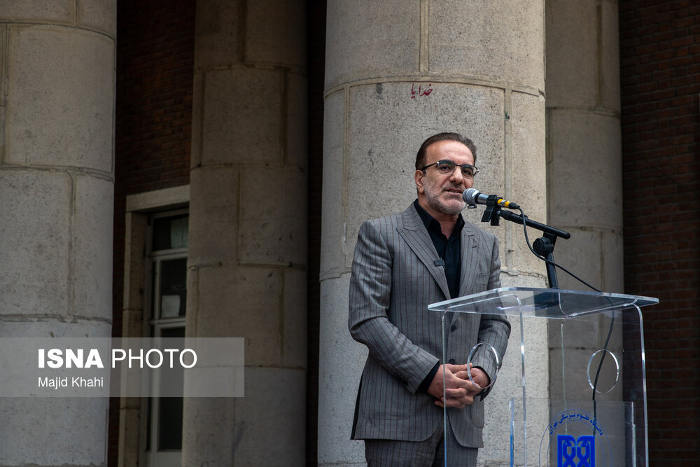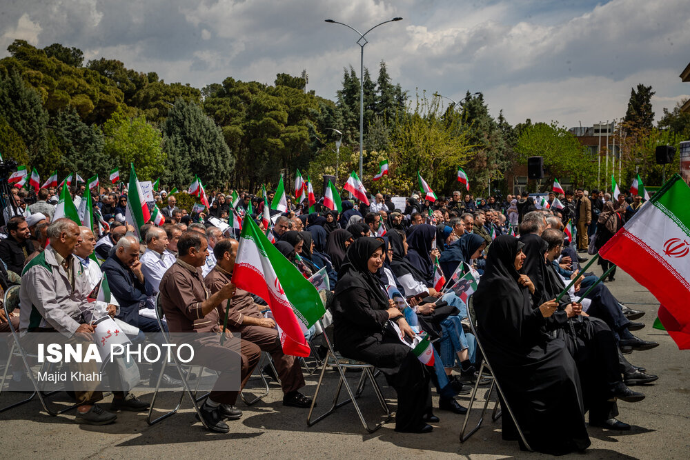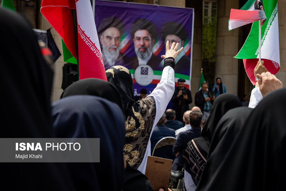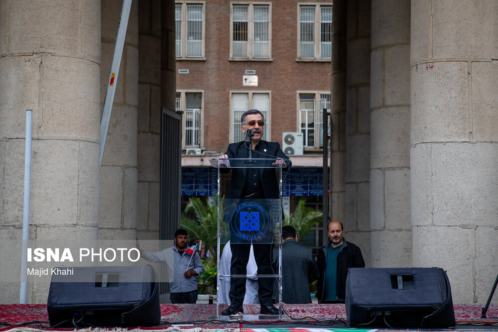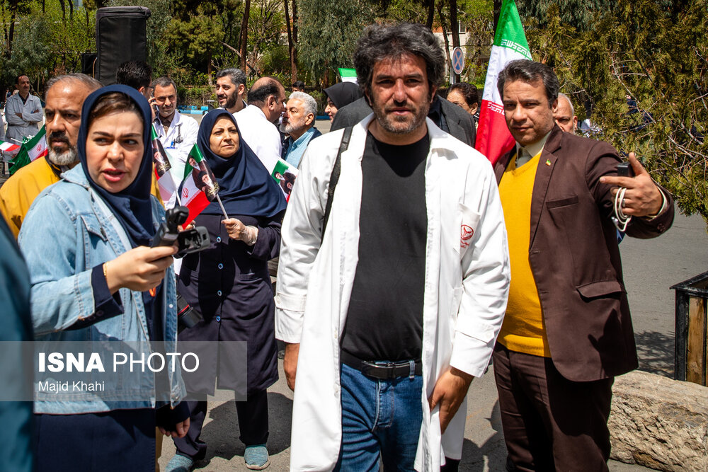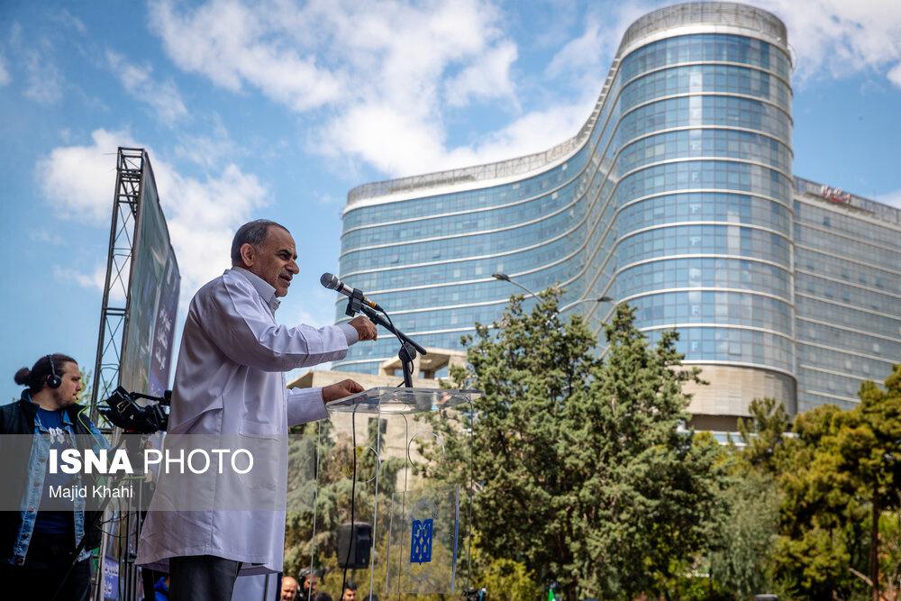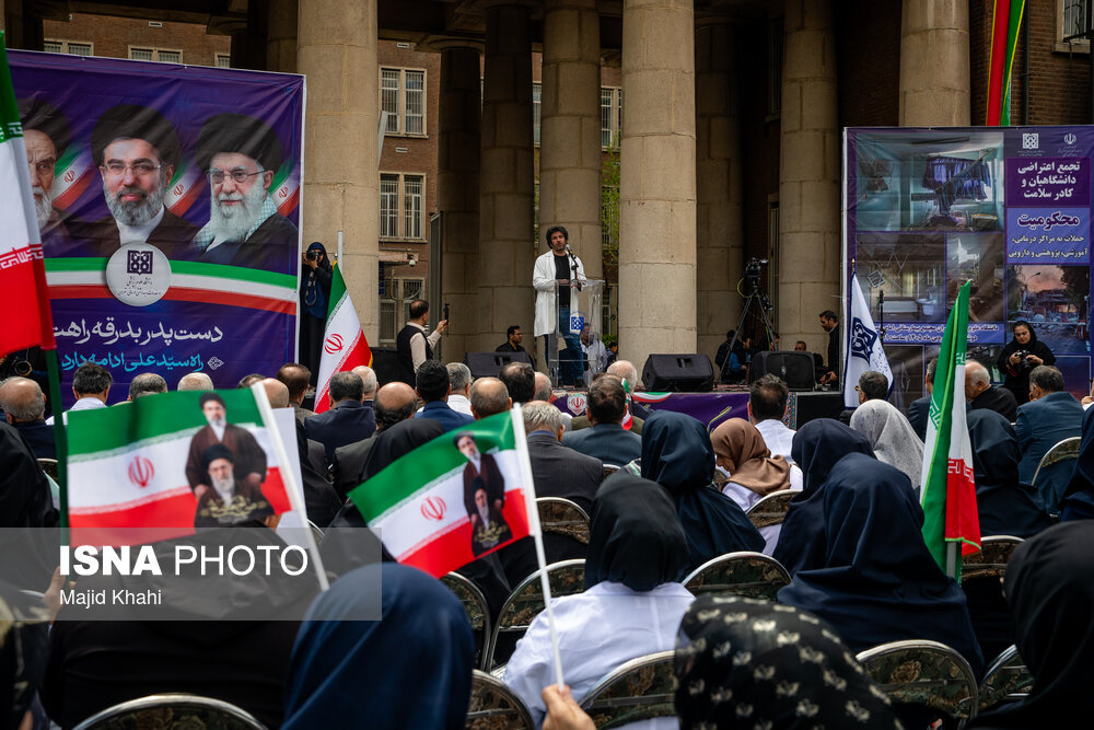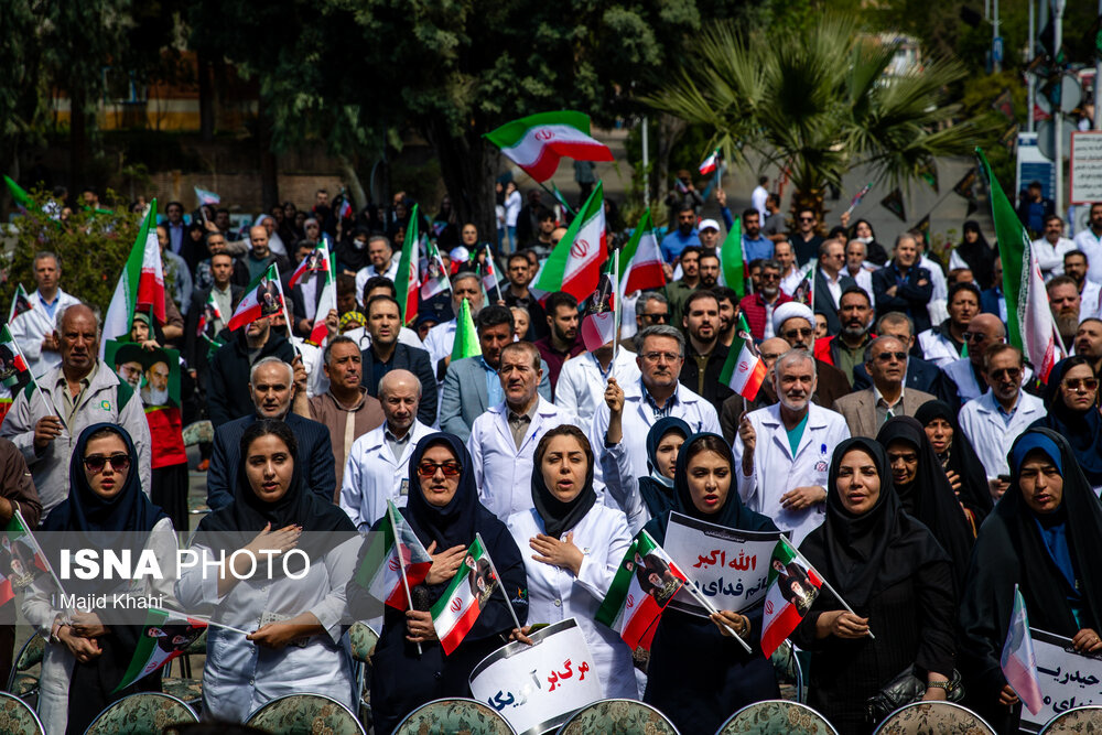 تجمع اعتراضی دانشگاهیان و کادر سلامت در محکومیت حملات آمریکا و رژیم صهیونیستی به مراکز بهداشتی، درمانی و آموزشی دوشنبه ۱۷ فروردین ۱۴۰۵ در محل بیمارستان امام خمینی (ره) برگزار شد.|منبع: ایسنا